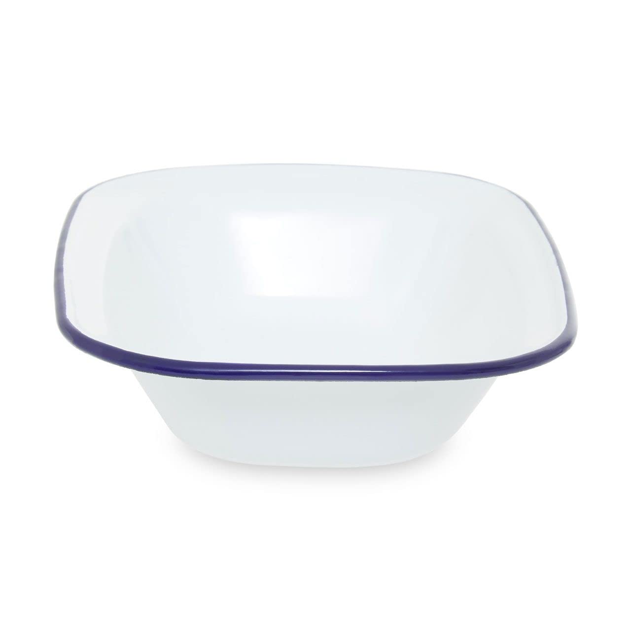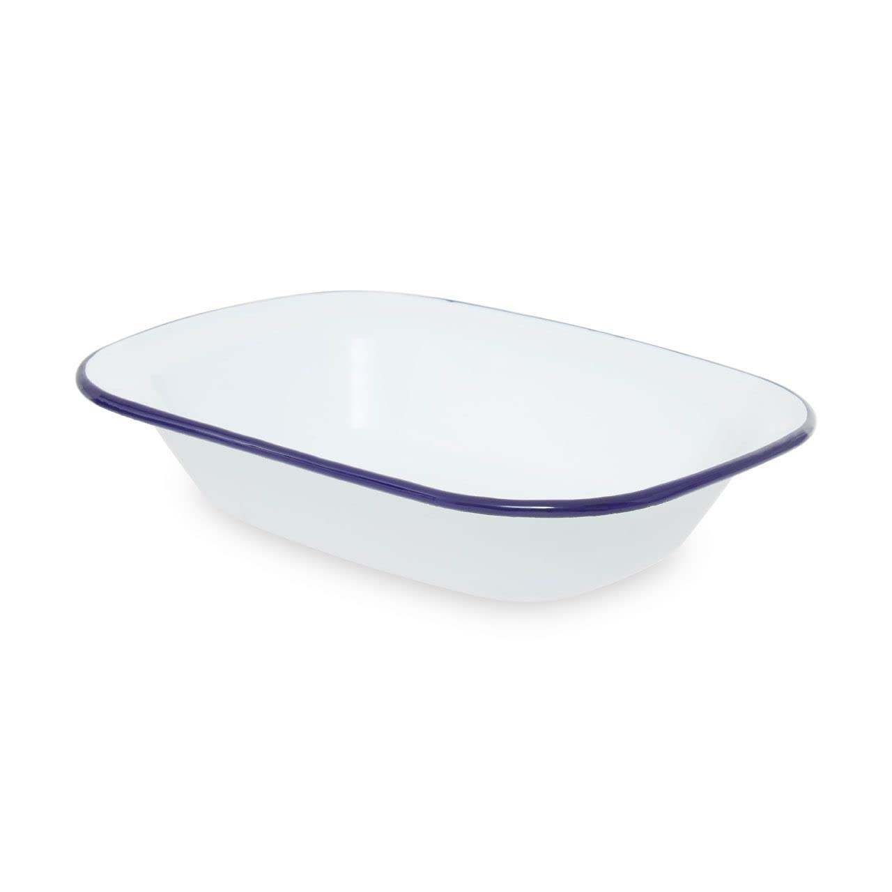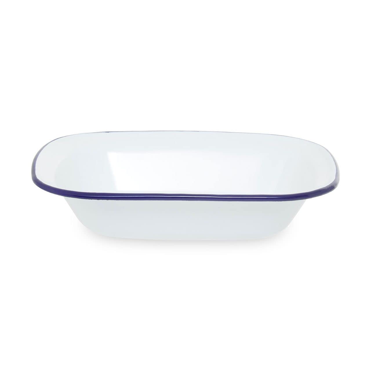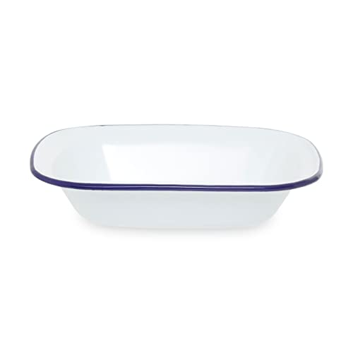 This 26cm rectangular pie dish has a sturdy steel design in a smooth white enamelled finish with a navy blue rim. The food grade coating is non stick and distributes heat evenly, making the dish perfect for puddings, roasted items, casseroles, side dishes or as a food storage container.