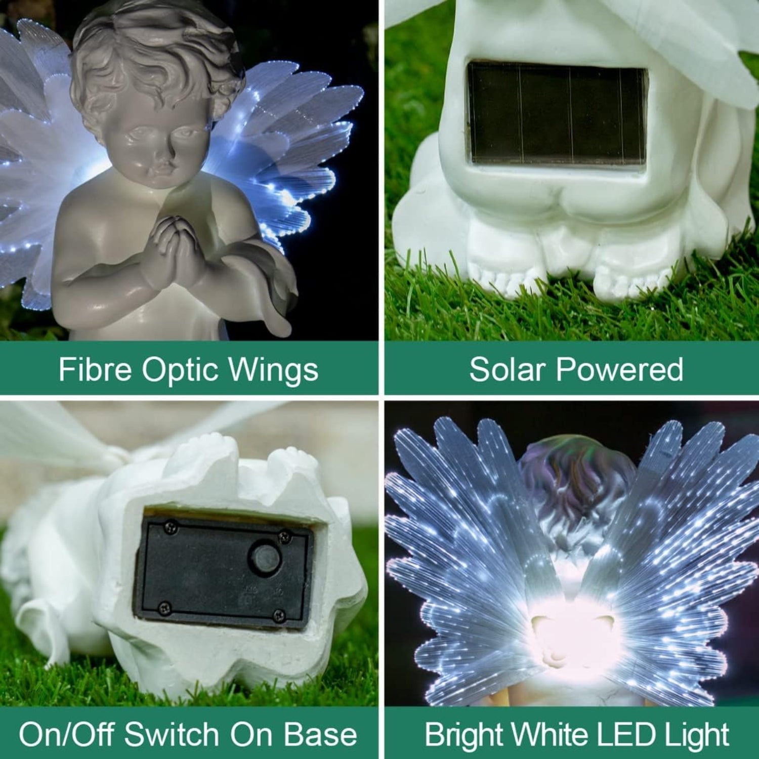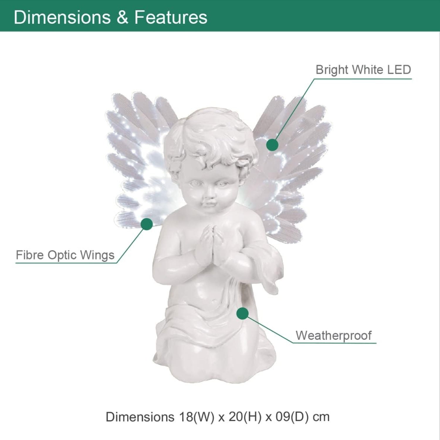 This 19cm x 9cm beautiful garden decoration angel has a light-up body and fiber optic wings, allowing for a serene garden feature to look over you and bring some peace and love to potentially troublesome times. This peaceful angel harnesses solar power and converts the natural sunlight of the daylight into a classic warm white illumination at dusk, along with additional bright light from its fiber optic wings. This decorative garden cherub is totally weatherproof and will turn on automatically thanks to the built-in solar panel fitted discreetly on the back of the ornament.