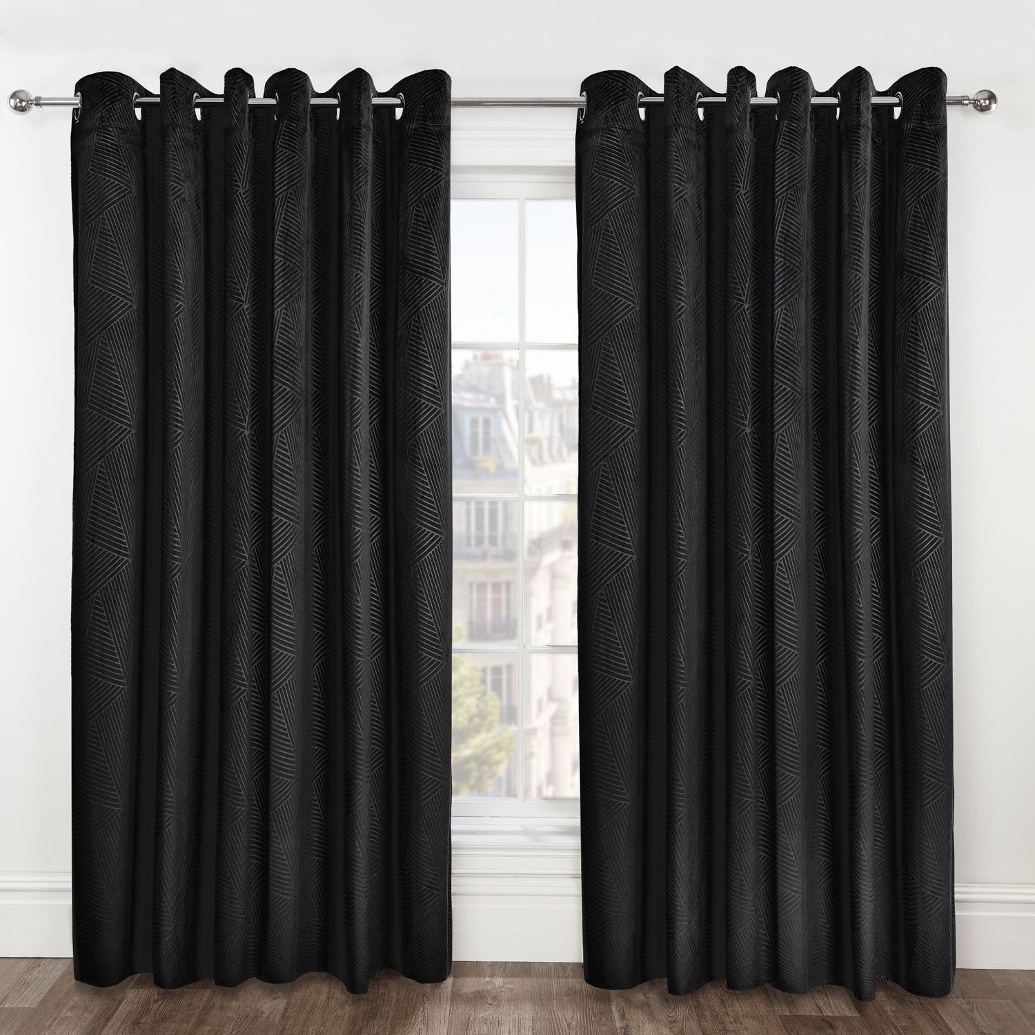 Geometric Velvet Thermal Blackout Curtains Eyelet Ring Top 90x90" Black