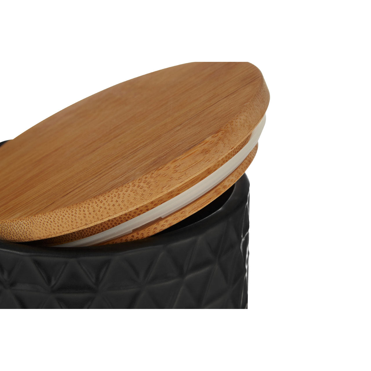Formed from strong and hard-wearing dolomite, this storage canister is suitable for everyday use. Its matte black finish accentuates the triangular pattern which extends across its surface. The lid is made from sustainable bamboo wood, with a rubber seal which keeps its contents fresh. Use it in the kitchen to store tea, coffee, or sugar.