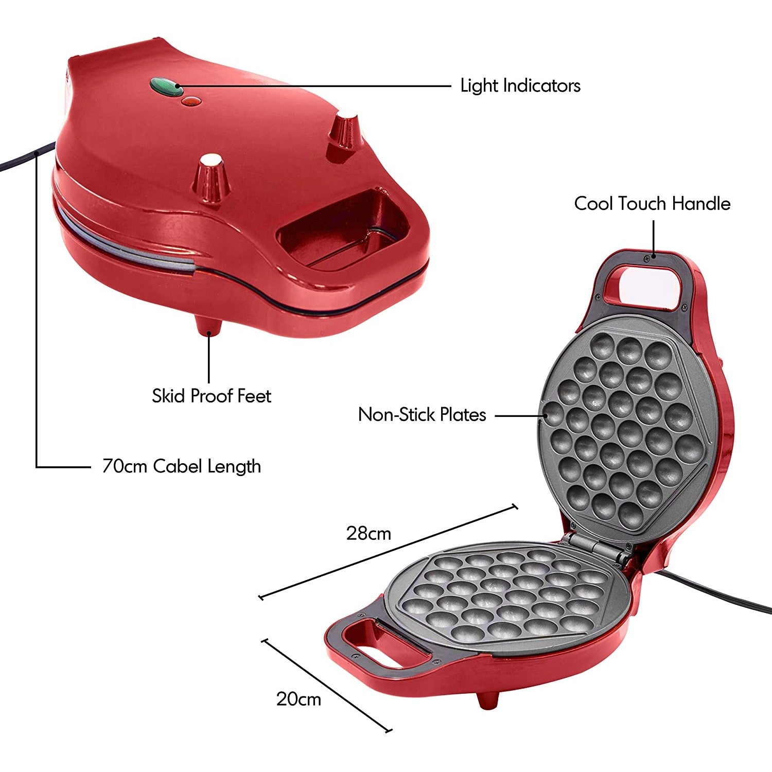 This unique bubble waffle maker ensures the perfect waffle every time. It's quick and easy to use, and the non-stick coating plates make it a stress-free clean. The thermostatic sensors ensure a golden-brown bake each time. With rubber feet on both sides of the device, you can turn half way through to make the best bubble waffles. Space-saving design allows for simple storage post use. Suitable for both breakfast meals and unique ice cream cones.