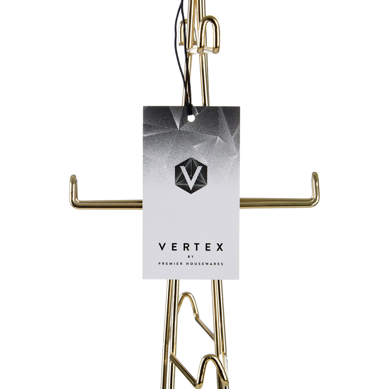 Formed from strong iron wire, the Vertex mug tree boasts a warm gold finish. Its broad base ensures stability, while the tree's wireframe ends in a diamond-shaped finial at the top. Each of its six arms curves upwards at the tip which ensures that mugs don't slide off while being displayed. Coordinate it with the Vertex fruit basket.