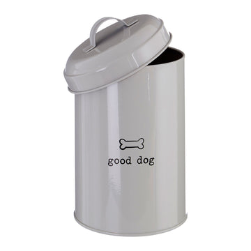 The container is made from non-corrosive galvanised steel, with a matching lid which is easy to remove thanks to its metal handle. A powder coated finish adds to its durability, the natural colour a neutral backdrop for the black "good dog" lettering and bone motif. With a 1.2 litre capacity, it holds enough dry food to keep the dog rewarded. H18 x W11 x D11cm.