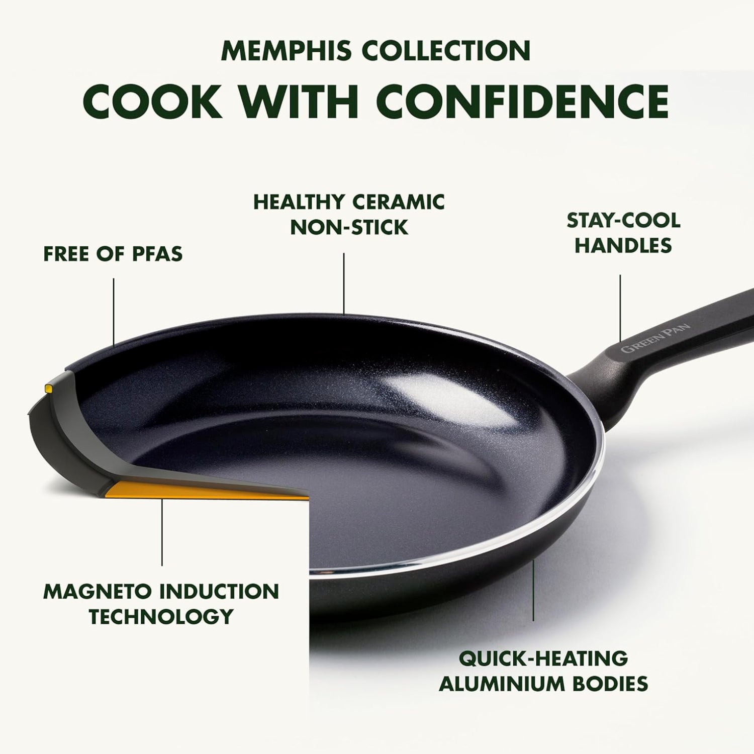 Designed to make cooking quick and easy, this collection features quick-heating aluminium bodies, so you can get to your meal faster. Each pan is finished with our signature PFAS-free ceramic non-stick coating, so every meal you make can be a little healthier. The Bakelite handles stay cool while you’re cooking, and these pans perform on any hob thanks to the Magneto induction base.