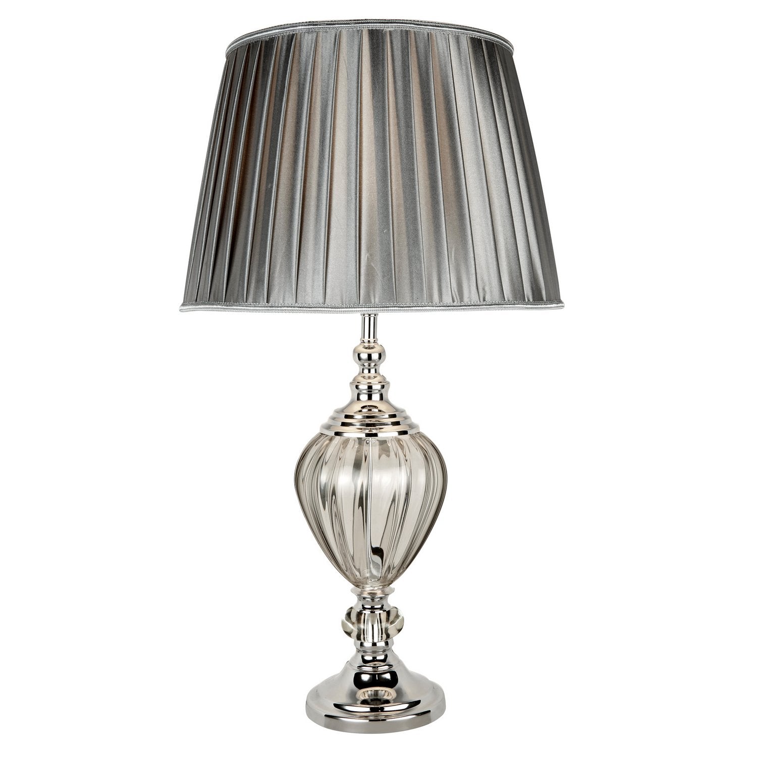 Make an impact in your living room, bedroom or study with this stunning table lamp that exudes class. The pewter colour pleated and tapered shade has a lovely metallic finish which will suit a range of decors. Clear glass forms the curved base and it is complete with a chrome trim.