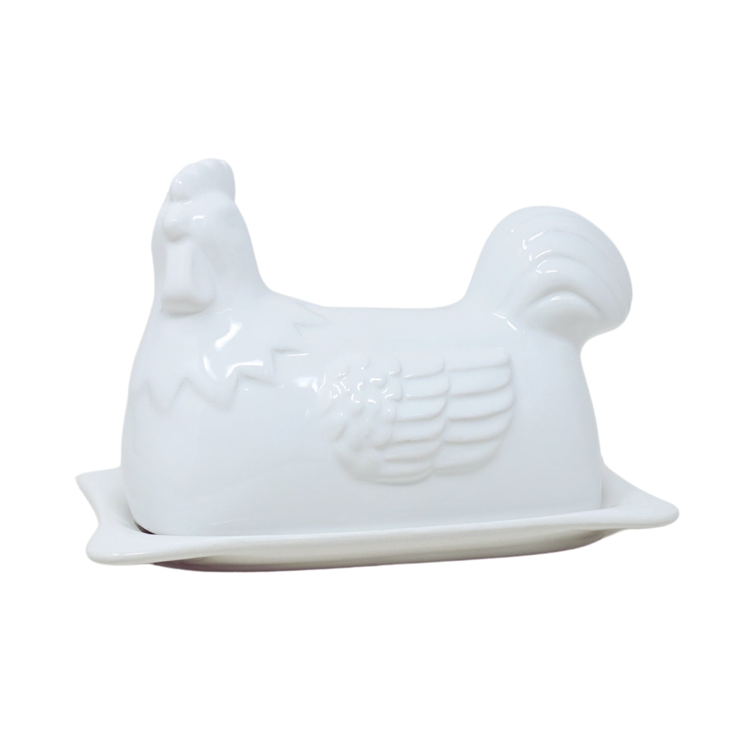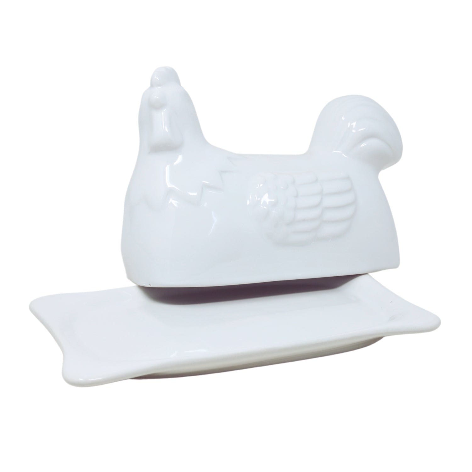 This hen-shaped porcelain butter dish will add rustic charm to your dining table. Designed with a detailed hen lid, it is both functional and decorative, making it a delightful addition to any farmhouse-style or country kitchen.