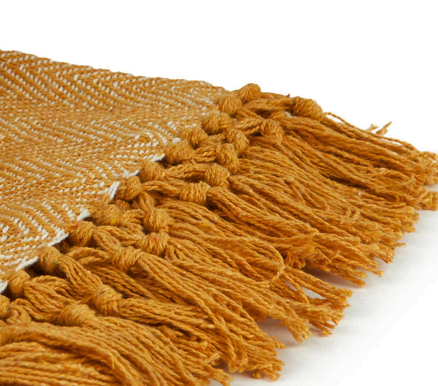 This luxury 100% cotton fringed tassel throw in ochre mustard yellow gives a decorative style to your home or can be used as furniture cover or can also be used as decorative throws on bed. Material is 100% Cotton (Made from recycled material) and it is dry clean only.