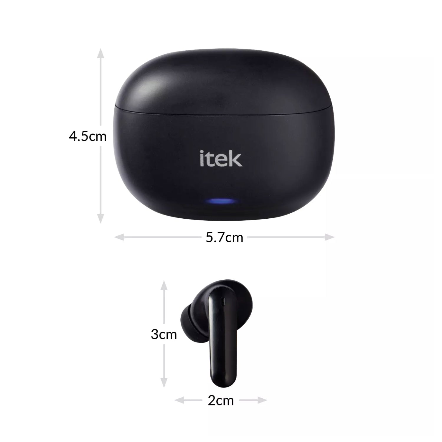Charging case - H: 4.5 x L: 5.7 cm, Earbud - H: 3 x L: 2 cm