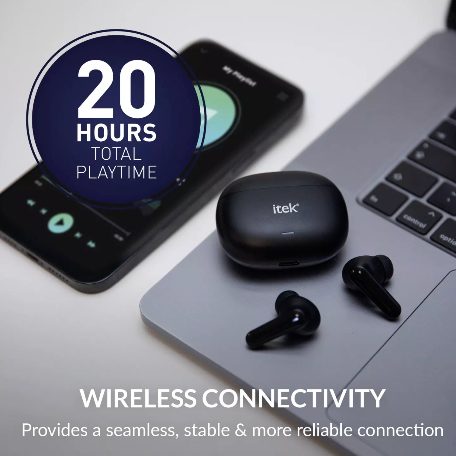 The iTek I59005BLK True Wireless Earbuds deliver premium sound and convenience in a compact, stylish design. Offering up to 16 hours of playtime with the included USB-C charging case, these earbuds are perfect for daily commutes, workouts, and travel.