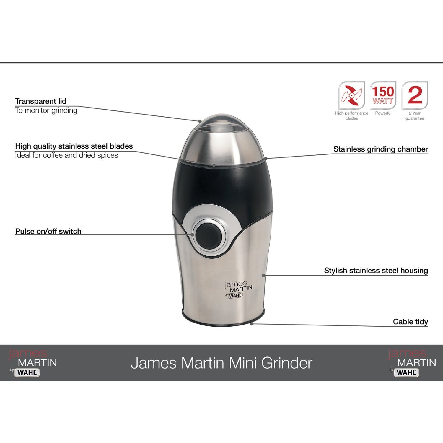 - The James Martin by Wahl Mini Grinder is ideal for grinding dry spices or coffee beans thanks to its powerful 150-watt motor and stainless-steel blade.