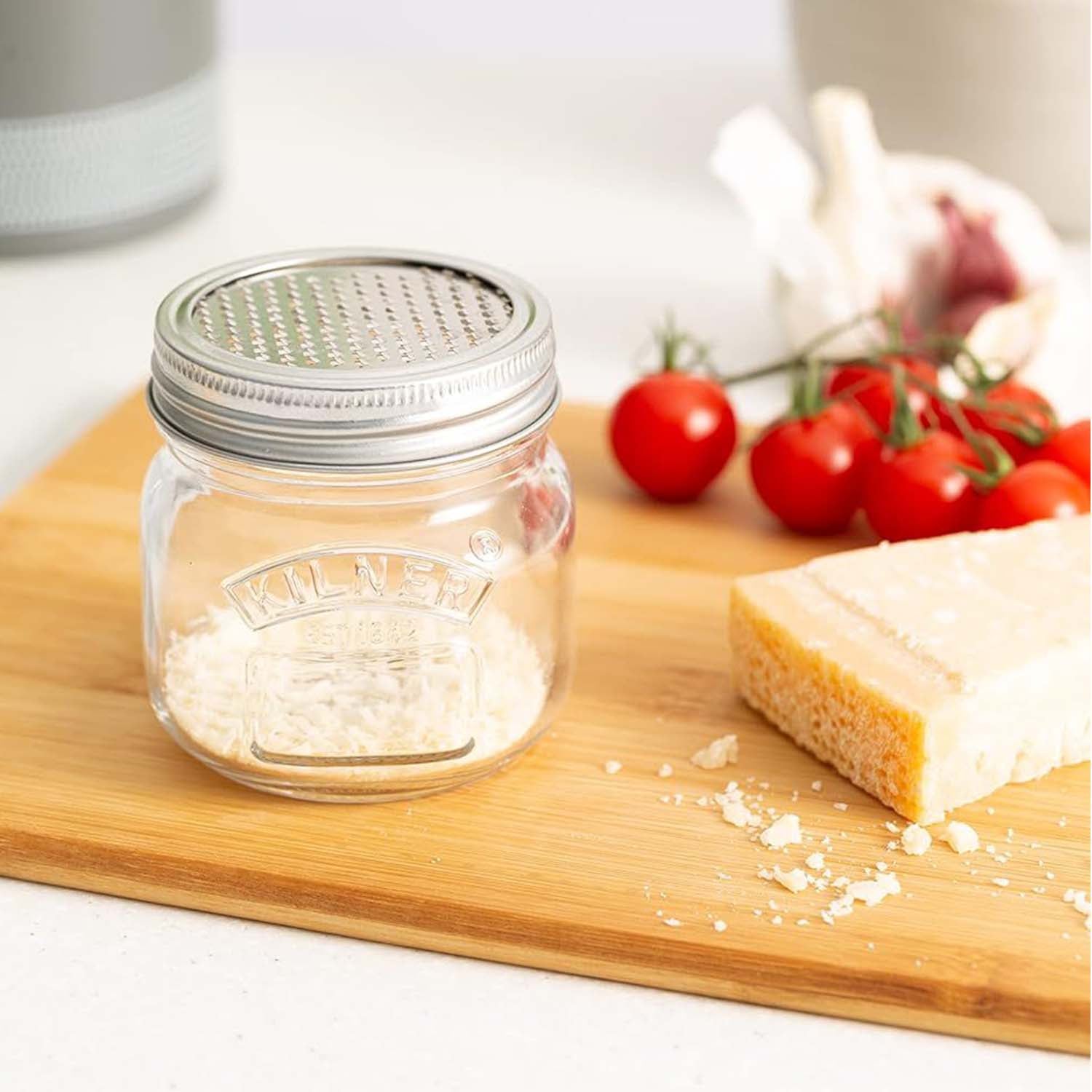 The Kilner Storage Jar & Fine Grater is a compact and versatile kitchen essential, combining a 250ml clear soda lime glass jar with a two-piece stainless steel lid. The lid includes a screw band and a micro-blade grater disc, ideal for finely grating hard ingredients like chocolate or nutmeg, and pulping softer foods like garlic and ginger.