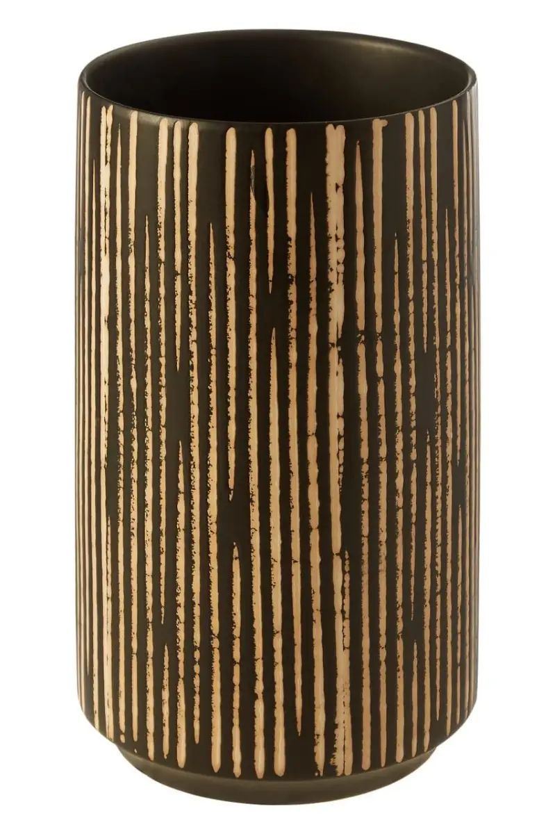 Handcrafted by expert artisans, this cylindrical vase features a smooth black surface accented with cream vertical lines. Perfect for showcasing long stem plants and flowers.