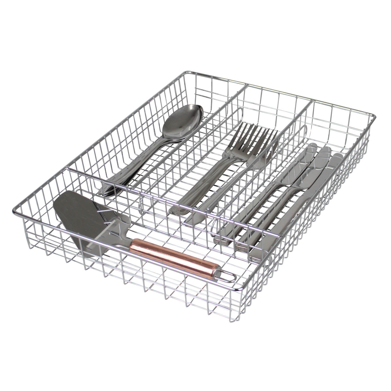 - A 4 compartment steel wire cutlery tray for tidy kitchen drawer organisation. This is an essential cutlery organiser in a rectangular form crafted from durable metal wire and divided into 4 different size compartments to hold a range of kitchen cutlery or utensils in an organised manner.