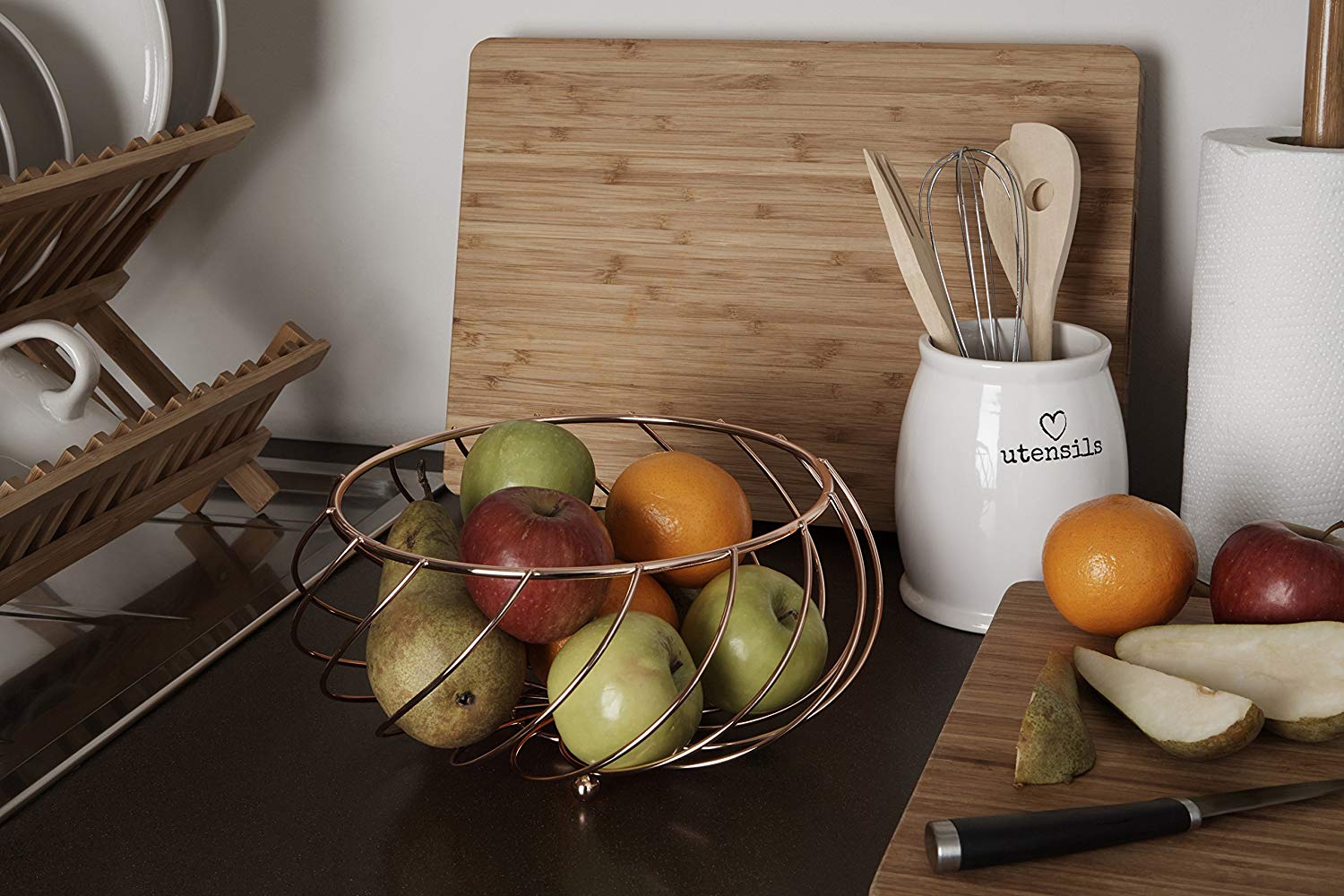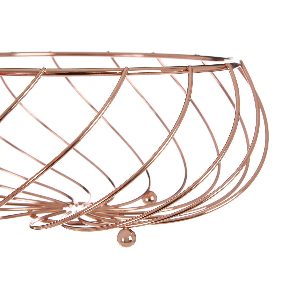 A beautiful way to store your favorite fresh fruits, the large Kuper fruit basket will make a wonderful centerpiece on your table or countertop. Made from robust metal wire, the basket is effortlessly shaped to create a sweeping basket design, while the rose gold finish helps to accentuate the contours. The bowl shape provides ample space for oranges, apples, pears, and more while ensuring the stability of the stand. 3 small ball feet ensure the round bowl is stable at all times. Adding a glamorous touch to any setting, the Kuper fruit basket helps to keep your healthy options close to hand.
