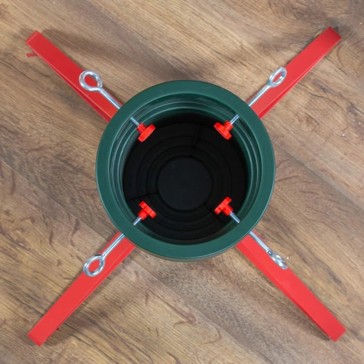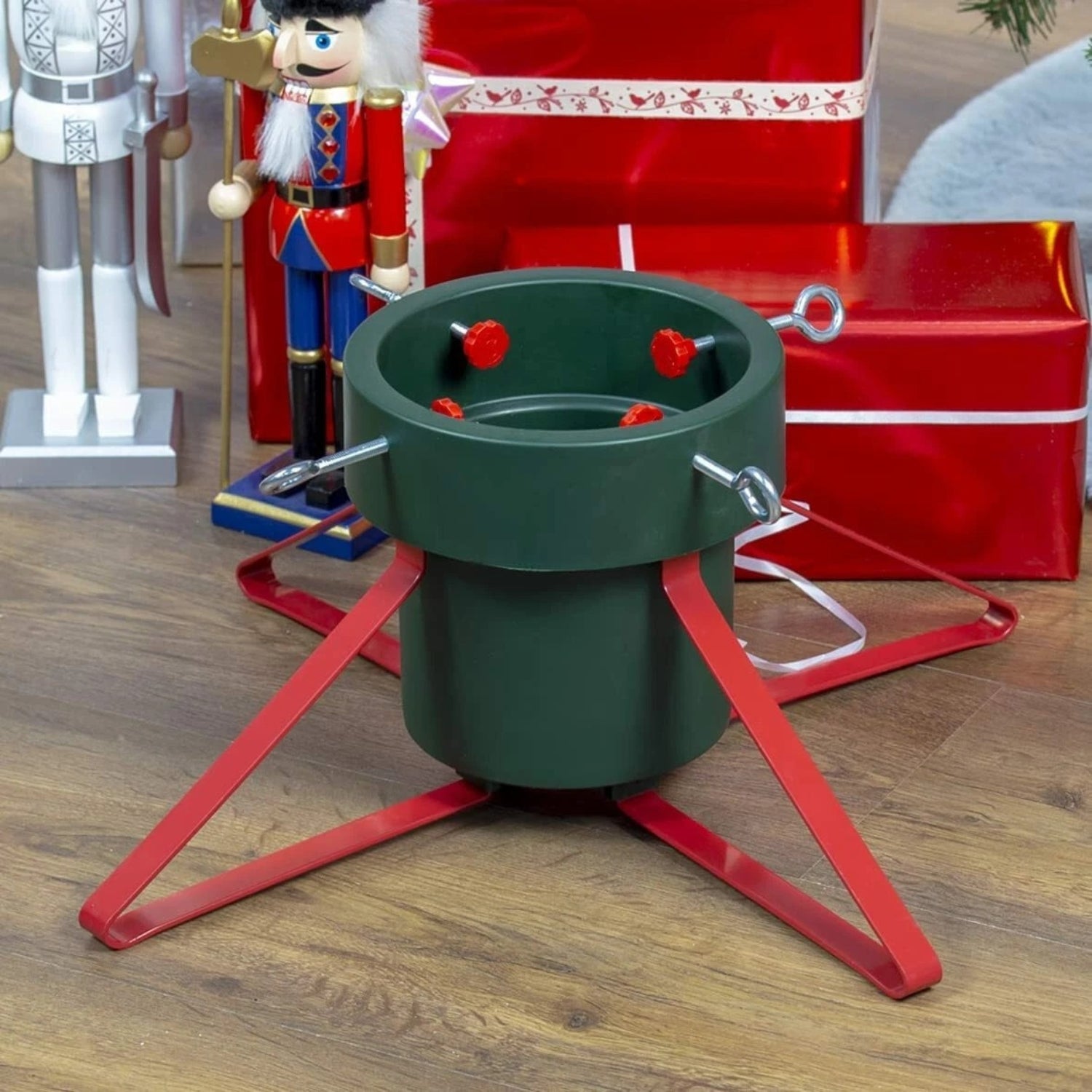 This large Christmas tree stand is designed to keep your tree securely upright throughout the festive season. It features a sturdy plastic pot supported by strong metal legs finished in a classic green and red colour scheme. Adjustable metal screws allow you to tighten the stand around tree trunks from 5 to 11 cm thick, ensuring a firm and stable hold. With a generous 46 cm base and 19 cm height, it can safely support trees up to 2 m tall. Simple to set up and built for reliability, this stand is ideal for both real and artificial Christmas trees.
