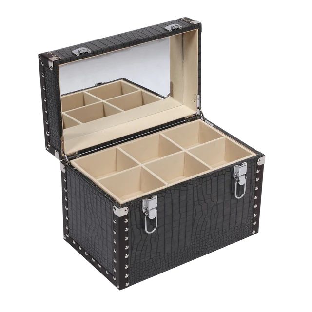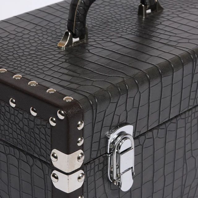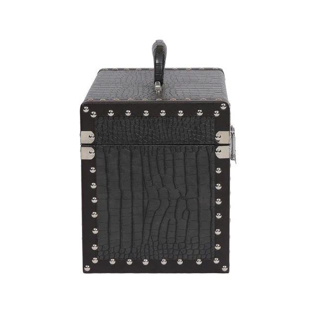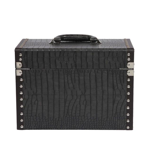 Effortlessly store and arrange your valuables with our large, Matte Black Crocodile Vanity Case. Highlighting a detachable jewellery tray and a lid interior mirror, it seamlessly blends style and functionality. Elevate the storage of your essentials with elegance.
