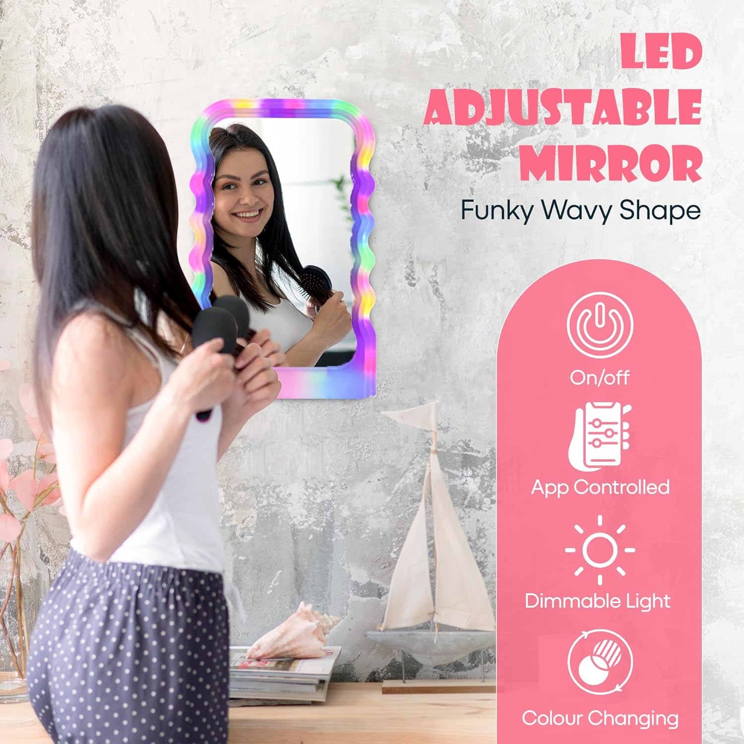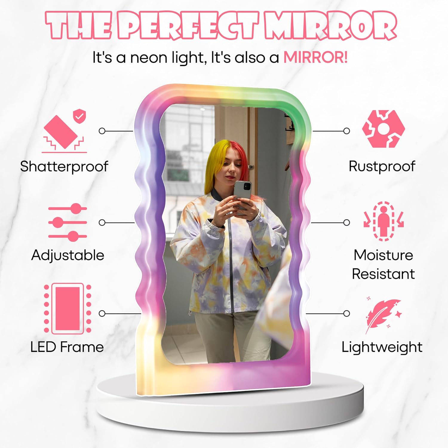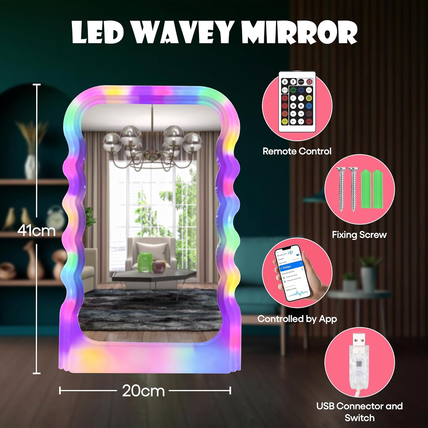 Add a bold, colorful touch to your space with this LED Wave Mirror featuring RGB lighting and a remote control. Ideal for bedrooms, vanity setups, or aesthetic room decor, this eye-catching mirror offers multiple lighting modes to match your vibe—whether you're getting ready, filming content, or just setting the mood.