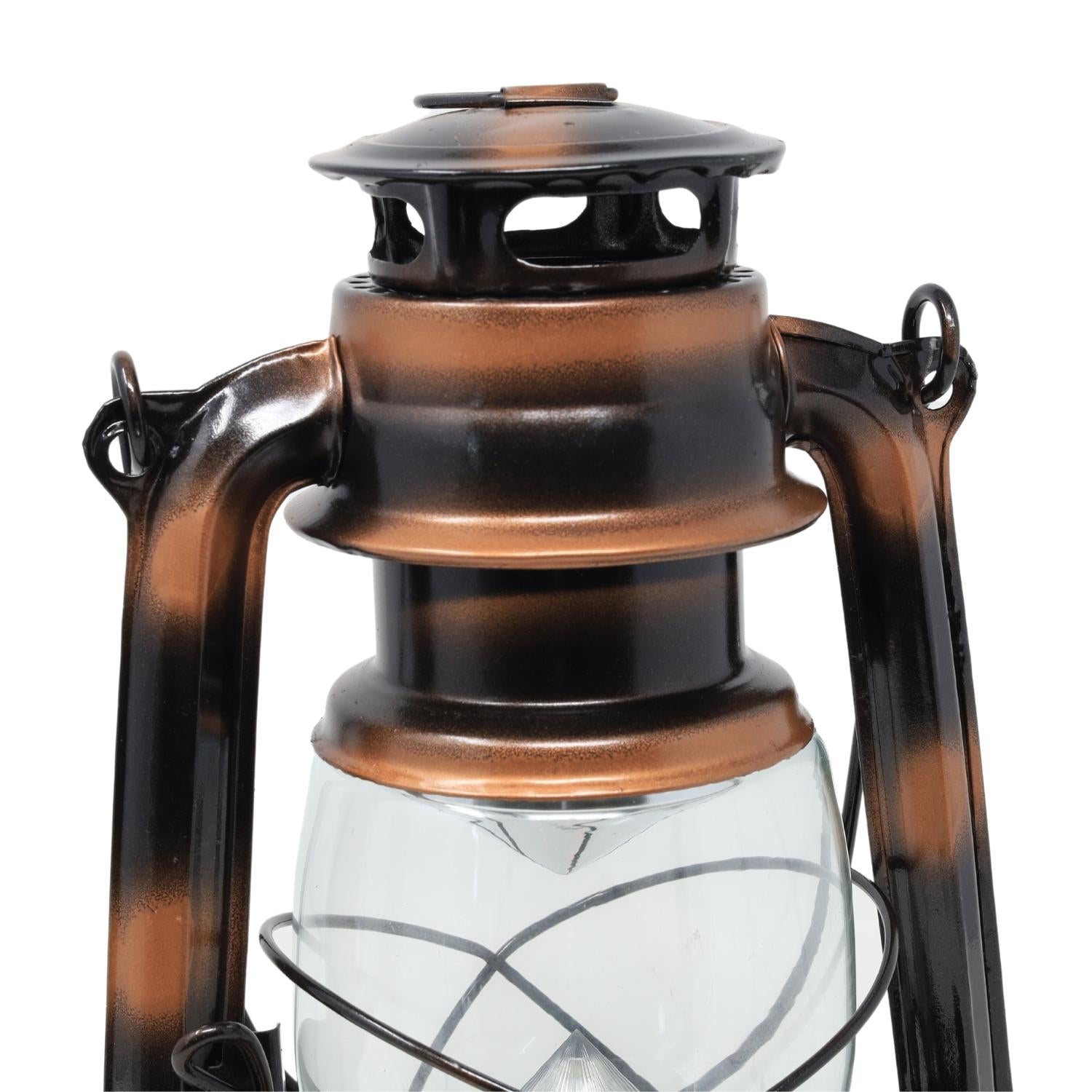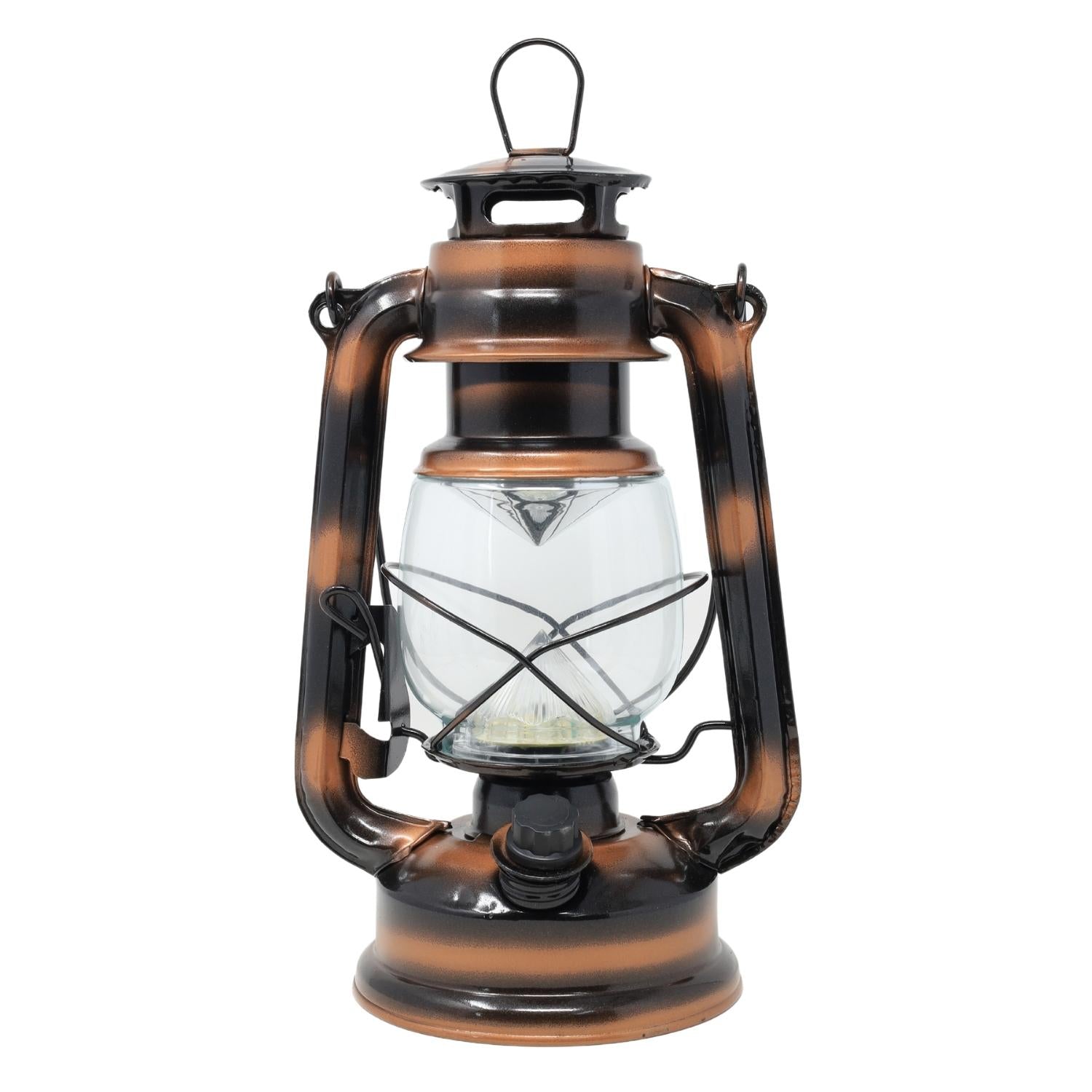 The LED Storm Lamp in copper has a vintage look similar to old oil and gas lanterns. This antique style is a great decorative piece to add to your home as well as a great table lamp for indoor or outdoor use.