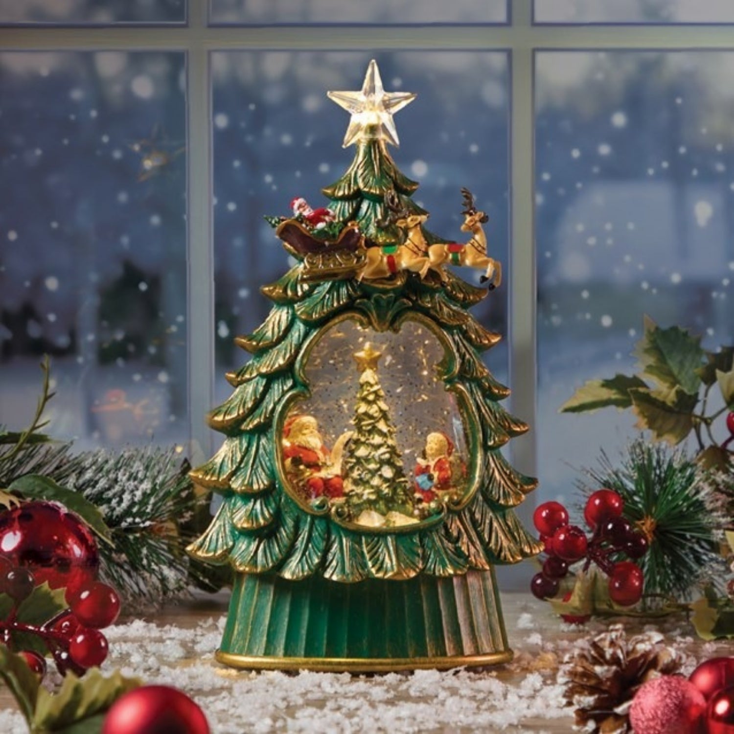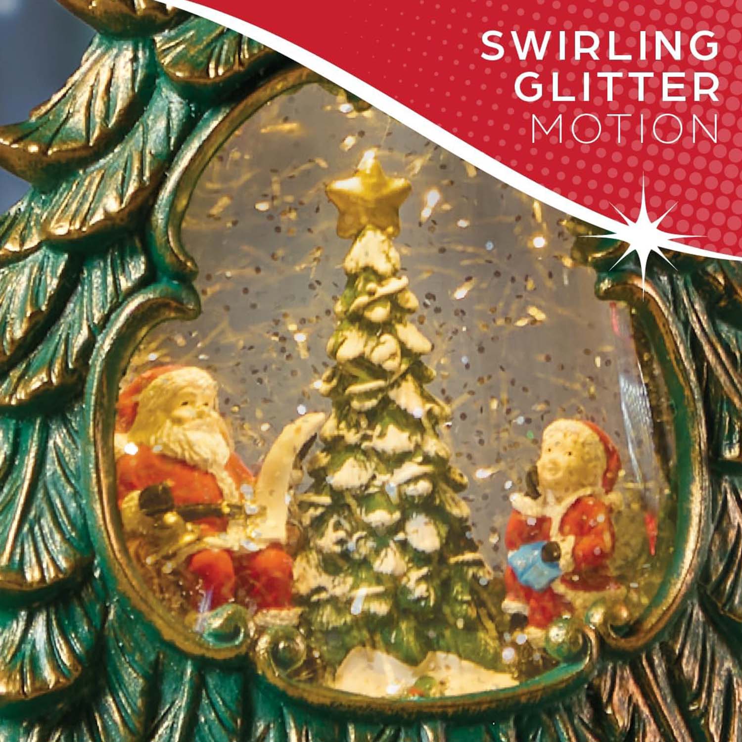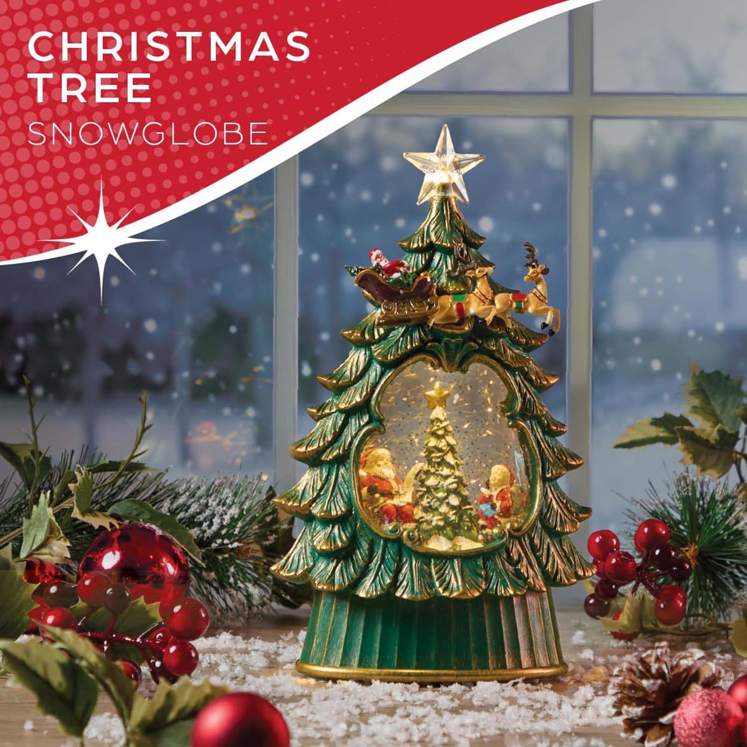 The Lightup Glowing Snow Globe Christmas Tree with Santa blends festive charm with elegant illumination. Encased in a tree-shaped frame topped by a star, the interior scene features Santa among holiday accents, with swirling glitter that captures the spirit of a gentle snowfall. Perfect for tabletops, shelves, or holiday displays in smaller spaces.