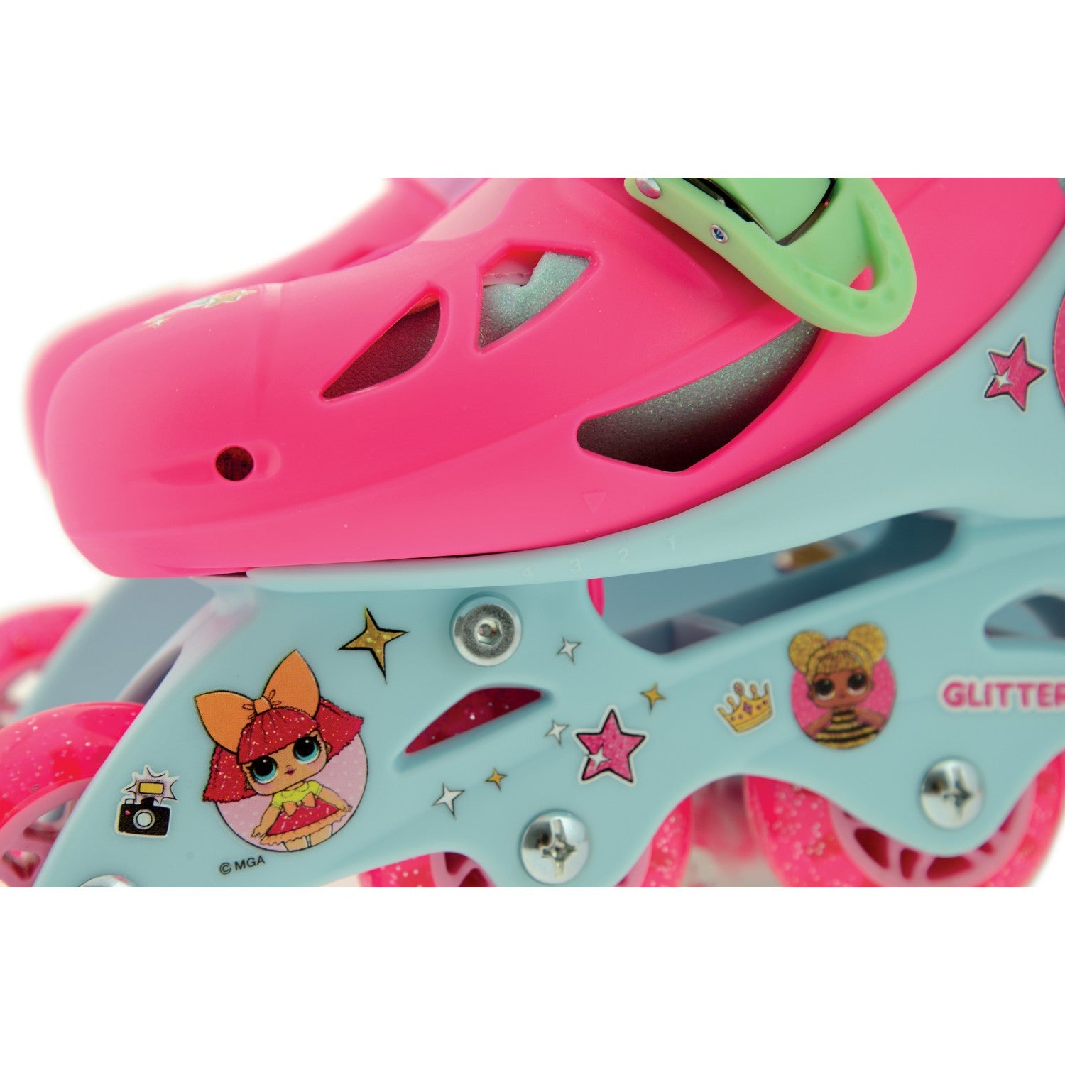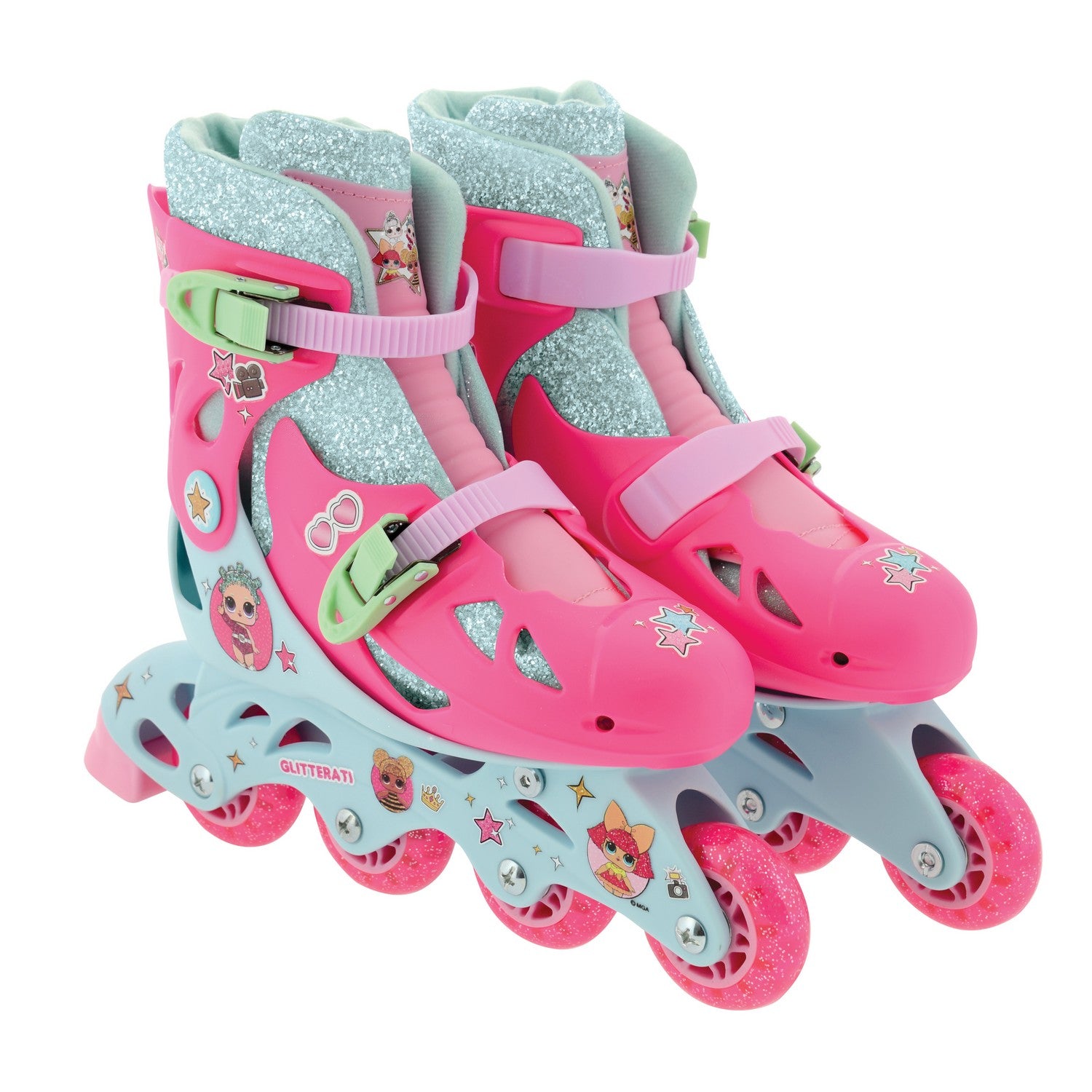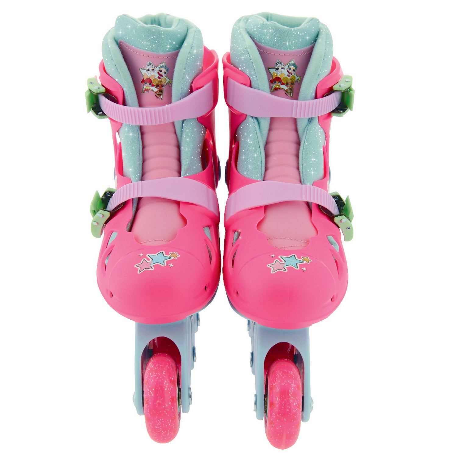 Double, easy ratchet adjusting straps for a secure fit. Easy push-button adjustment across 4 sizes. Pivoting heel cuff flexes with the foot for improved comfort and support. Comfortably padded glitter sock. Durable PP shell. Glitter PVC wheels with 608z bearings. Durable rear brake block. Character graphics. Glitter sticker sheet included for rider customisation. Shoe size 13J-3. Approx. product dimensions: L 11 x W 36 x H 42cm.