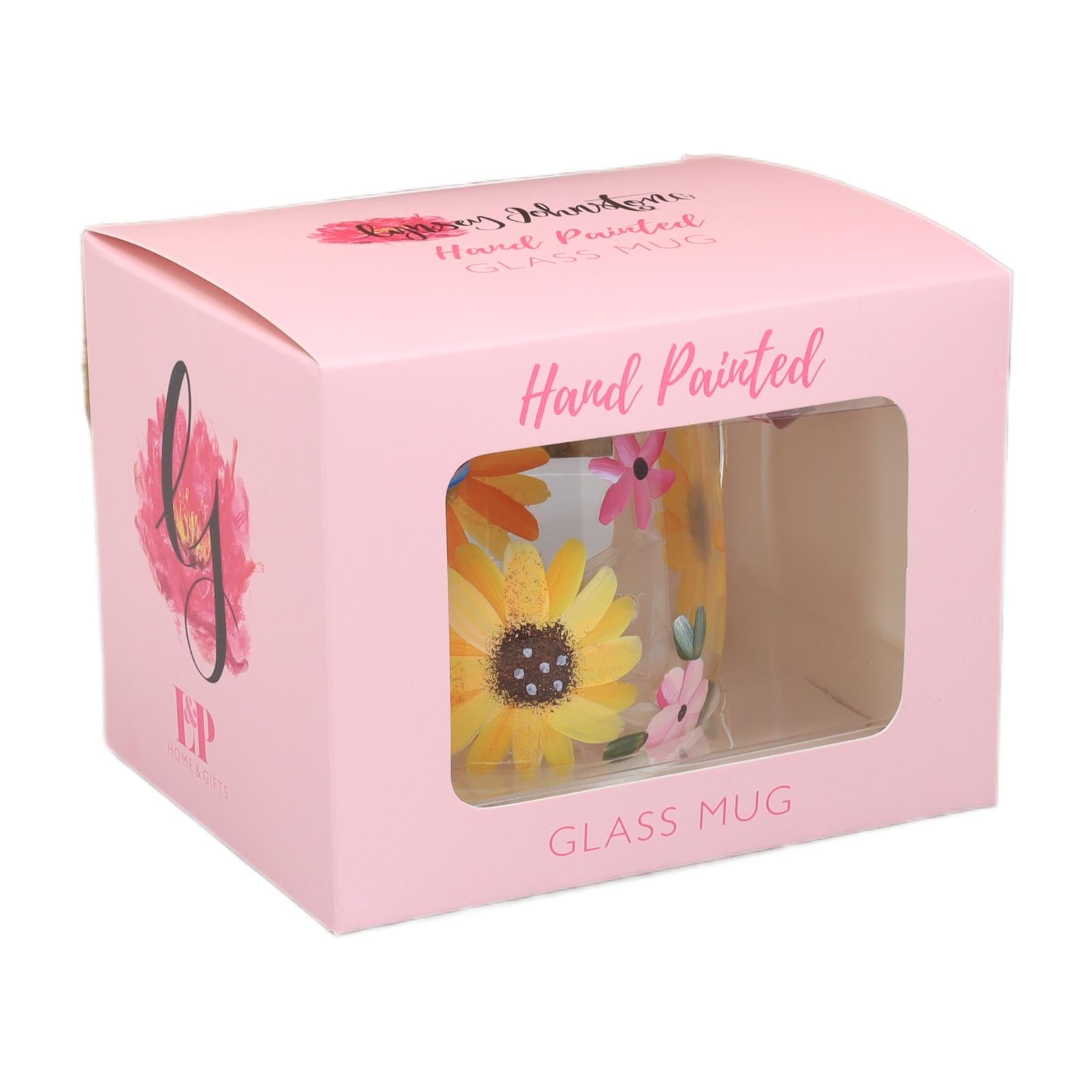 Elevate your drinkware collection with this beautifully crafted glass mug, featuring a vibrant hand-painted floral design by Lynsey Johnstone.