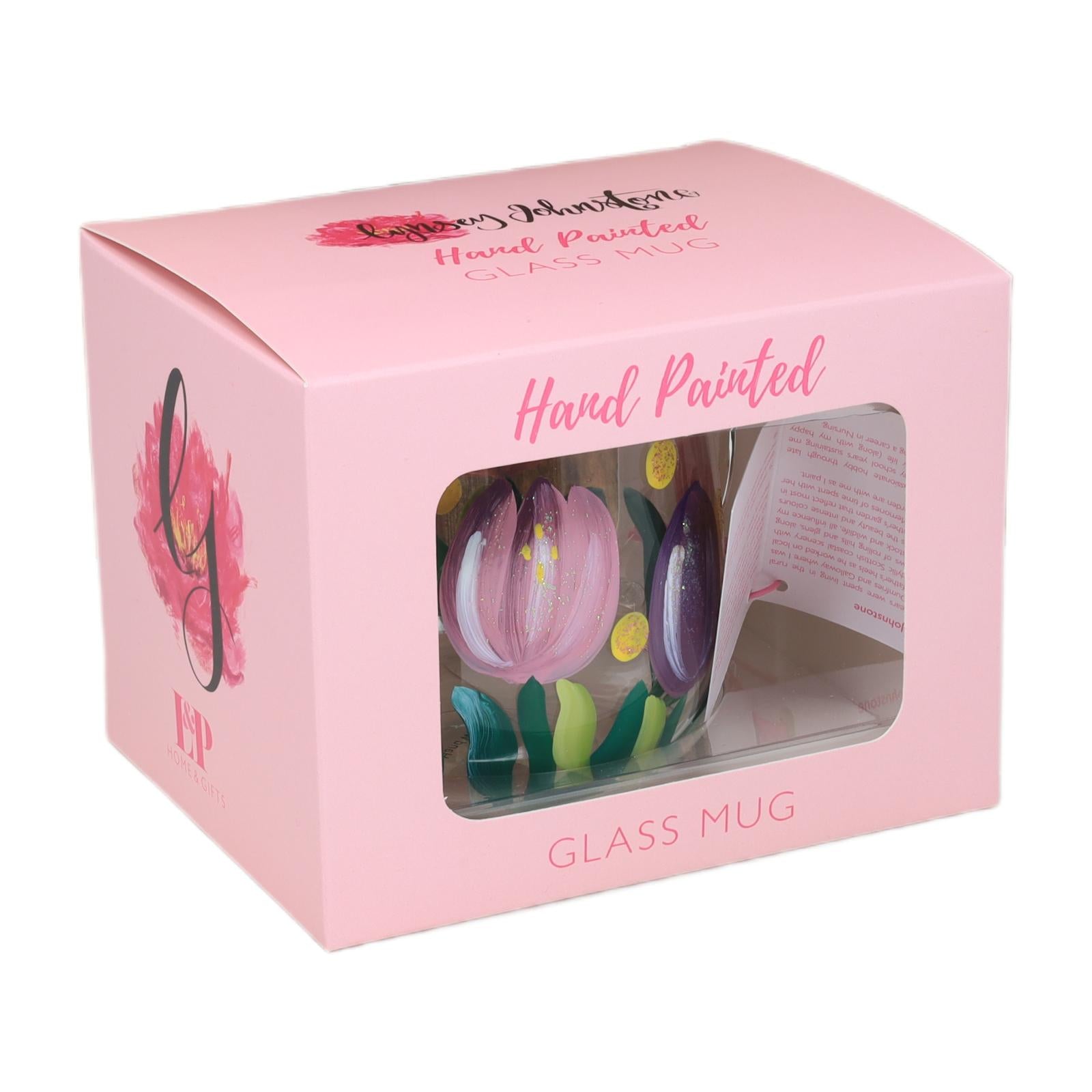 Elevate your drinkware collection with this beautifully crafted glass mug, featuring a vibrant hand-painted floral design by Lynsey Johnstone.