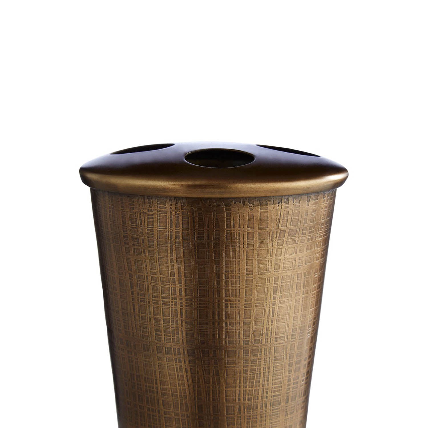 Four large holes are positioned in its top sections to hold toothbrushes, widely spaced to ensure the brush heads remain separate. The holder is made from rust-resistant stainless steel and has a rich antique brass color. Its surface features a series of horizontal and vertical scores for a slightly textured finish.