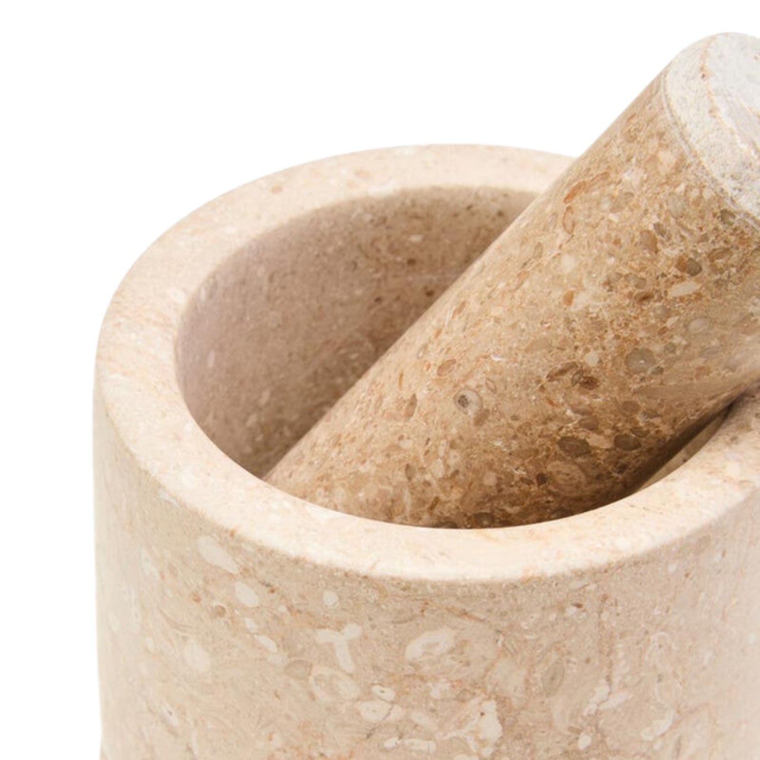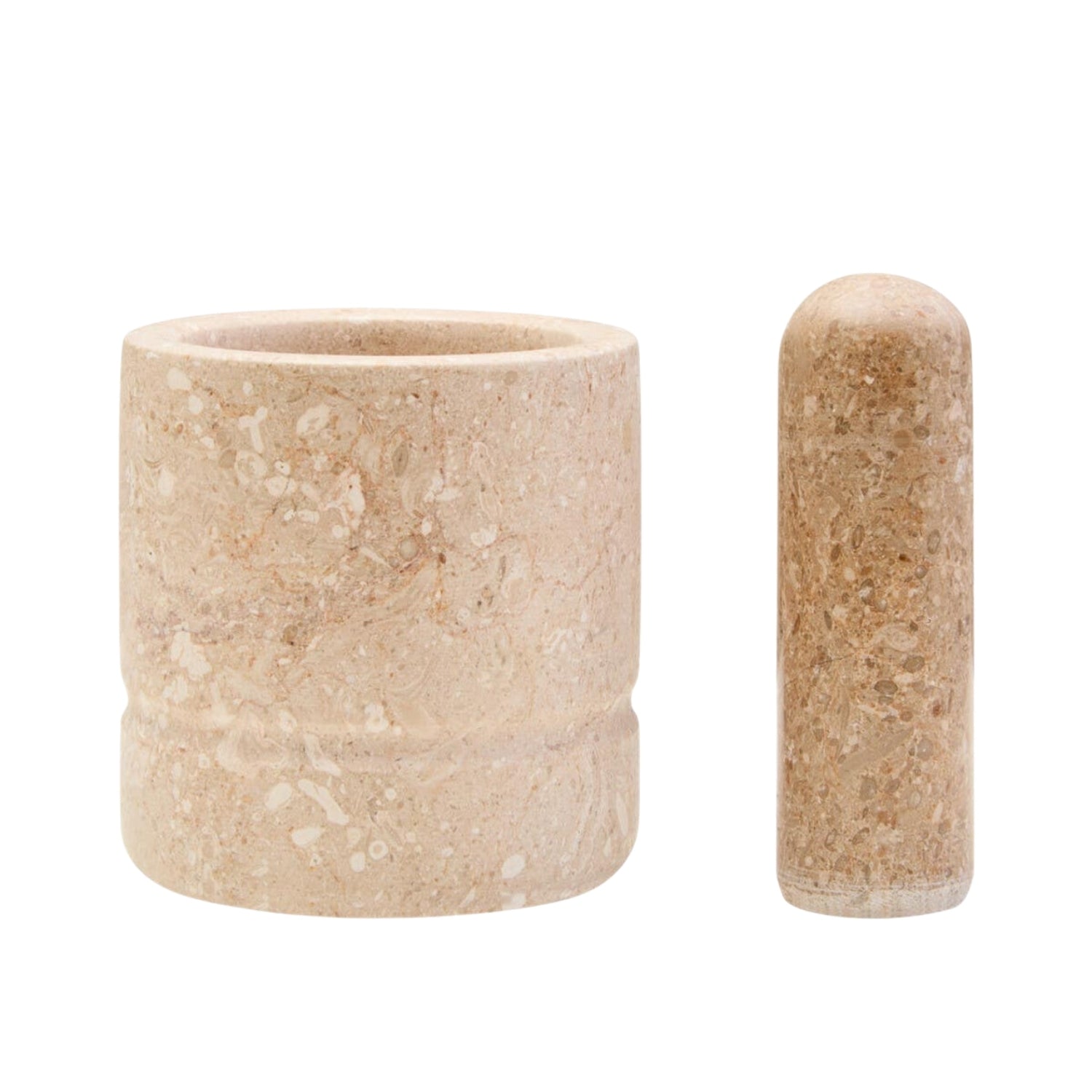 Handcrafted from natural marble, this mortar and pestle set offers a durable grinding surface and a natural warm-toned look. The cylindrical design and smooth finish make it both practical for kitchen use and suitable as a classic countertop piece. *This product is handcrafted, colours may vary due to the nature of the product.*