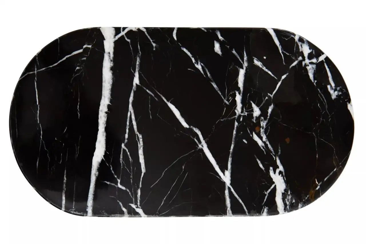 Black marble oval serving board with white veining for a sophisticated appearance. Timeless and durable, ensuring longevity and easy cleaning.
