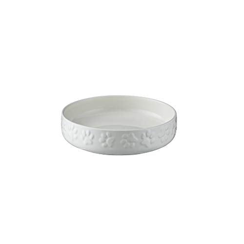 The Mason Cash Colour Mix Pet bowl range has a simplistic modern look . Produced from stoneware, the 13cm x 3cm cream cat saucer with embossed paws is durable, practical and difficult to top over.