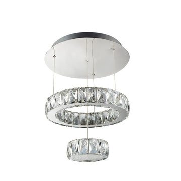 Add style and a modern edge, that will suit any contemporary home setting, with this 2 tier ceiling flush. The round chrome base and 4 cords suspend to 2 different sized rings, both embellished with clear glass. A warm white light will brighten any room of your choice. LEDs use up to 85% less energy and last up to 20 times longer than incandescent bulbs. Width: 35cm x Height: 70cm x Diameter: 35 centimetres.