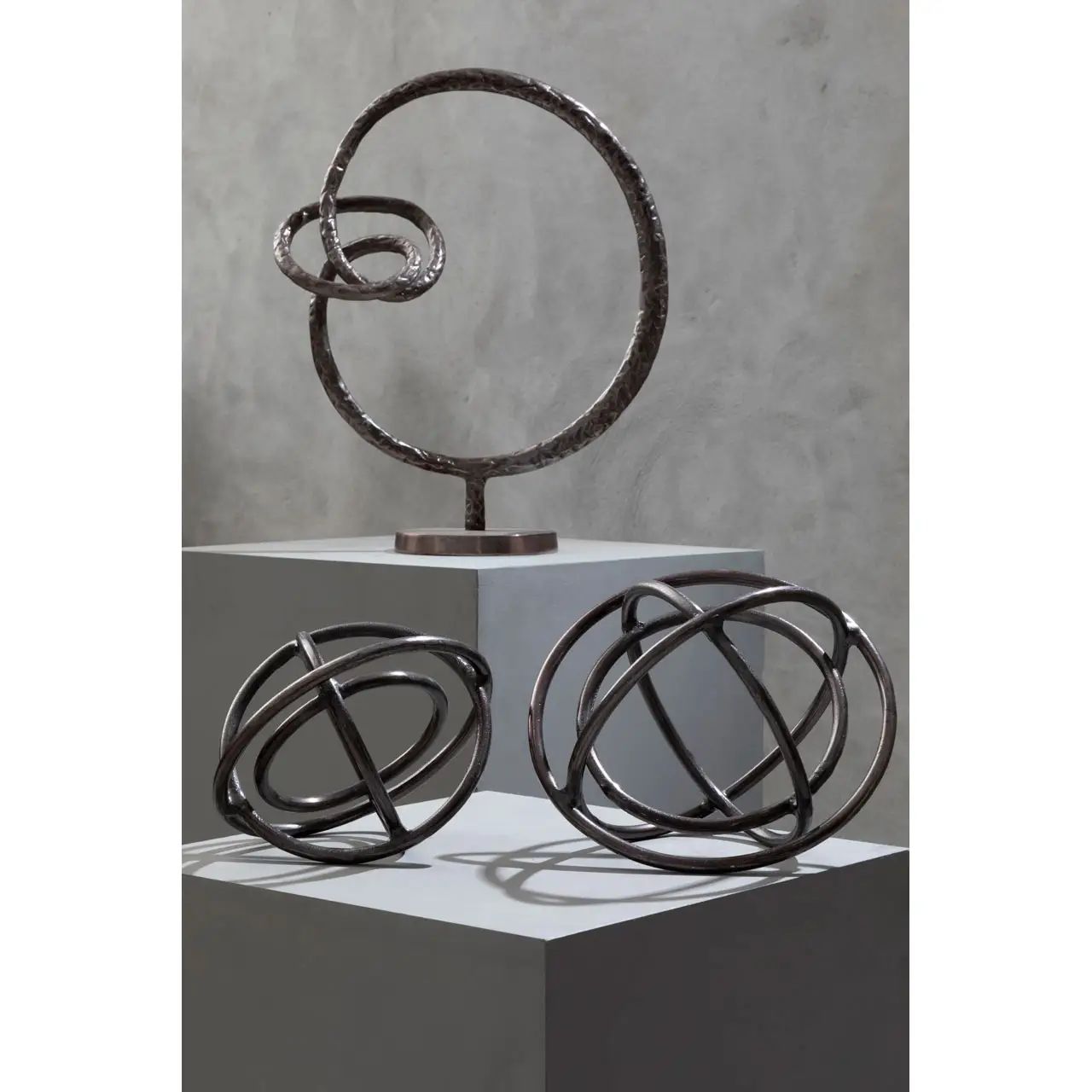 The sculpture's uneven, curling, and knotted form above contrasts with the smooth, round base below. Crafted from aluminum, it boasts a textured bronze finish.