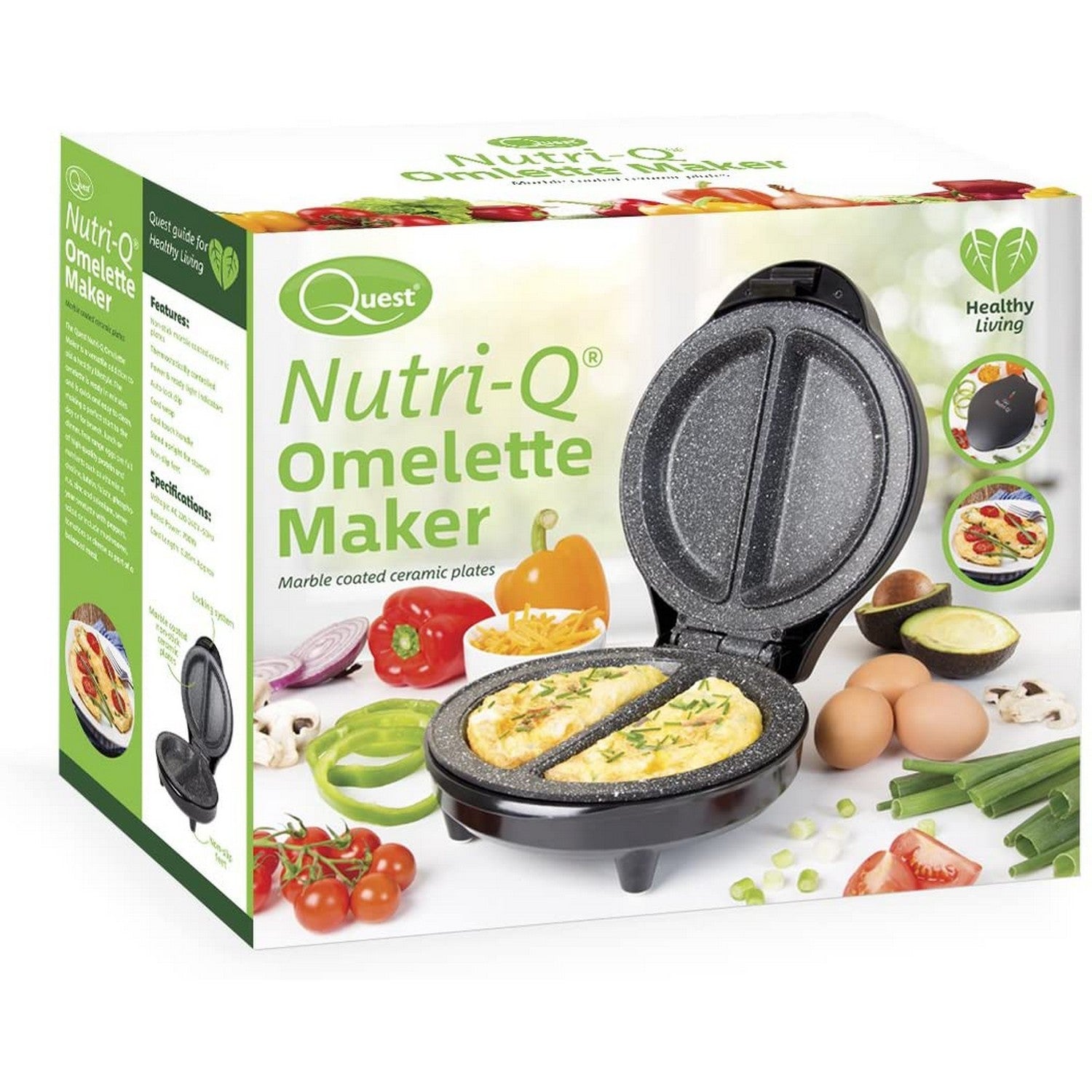 The Nutri-Q by Quest healthy eating brand has a range of small domestic appliances to help you live a healthier lifestyle and brings you ultimate healthy cooking twin omelette maker. This outstanding machine has marble coated non-stick ceramic plates for easy cleaning and perfect results every time. The Nutri-Q by Quest omelette maker couldn't be easier to use. Simply turn on and while it is warming up whisk eggs with the optional fillings you want to add and pour evenly between the two halves and close the lid. In minutes the contents will be done and two tasty perfectly cooked omelettes will be ready to eat. The stylish matt black finish is the finishing touch to the machine, just add ingredients to create a culinary touch of your own.