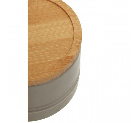This pack of 2 Fenwick storage canisters in trendy grey and cream finish will make a sophisticated addition to the shelf unit with its understated design. The wooden lid of this canister sits neatly on top of it with a silicone sealing to keep the contents airtight.