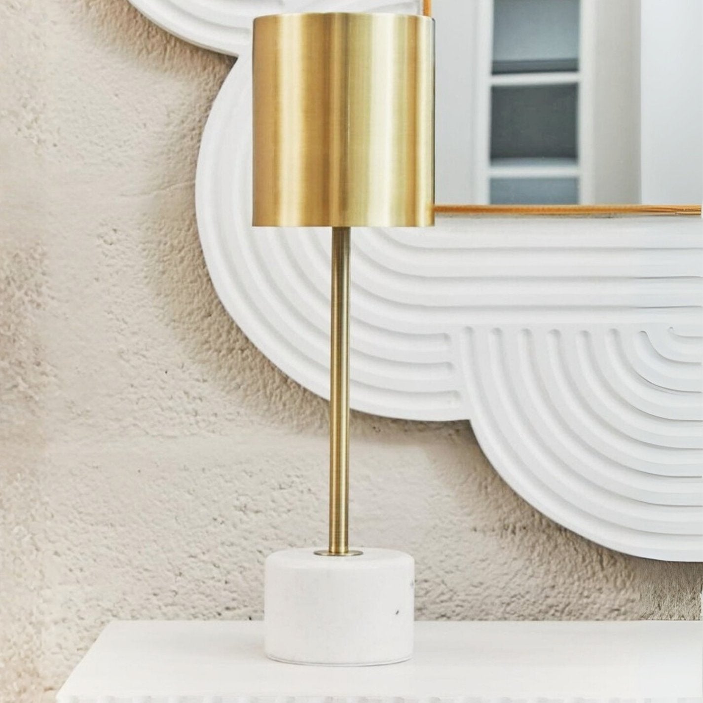 The Palazzo table lamp combines modern sophistication with timeless elegance, featuring a sleek brushed brass cylindrical stand and shade set atop a white marble block base with natural veining. Its minimal design and luxe materials make it a refined statement piece for the living room or bedside.