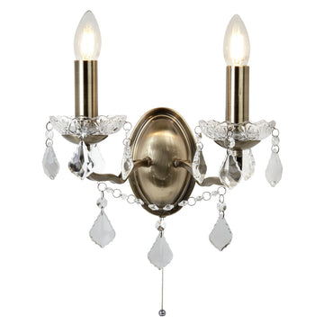 Paris 2 Lights Antique Brass Crystal Drops Wall Light