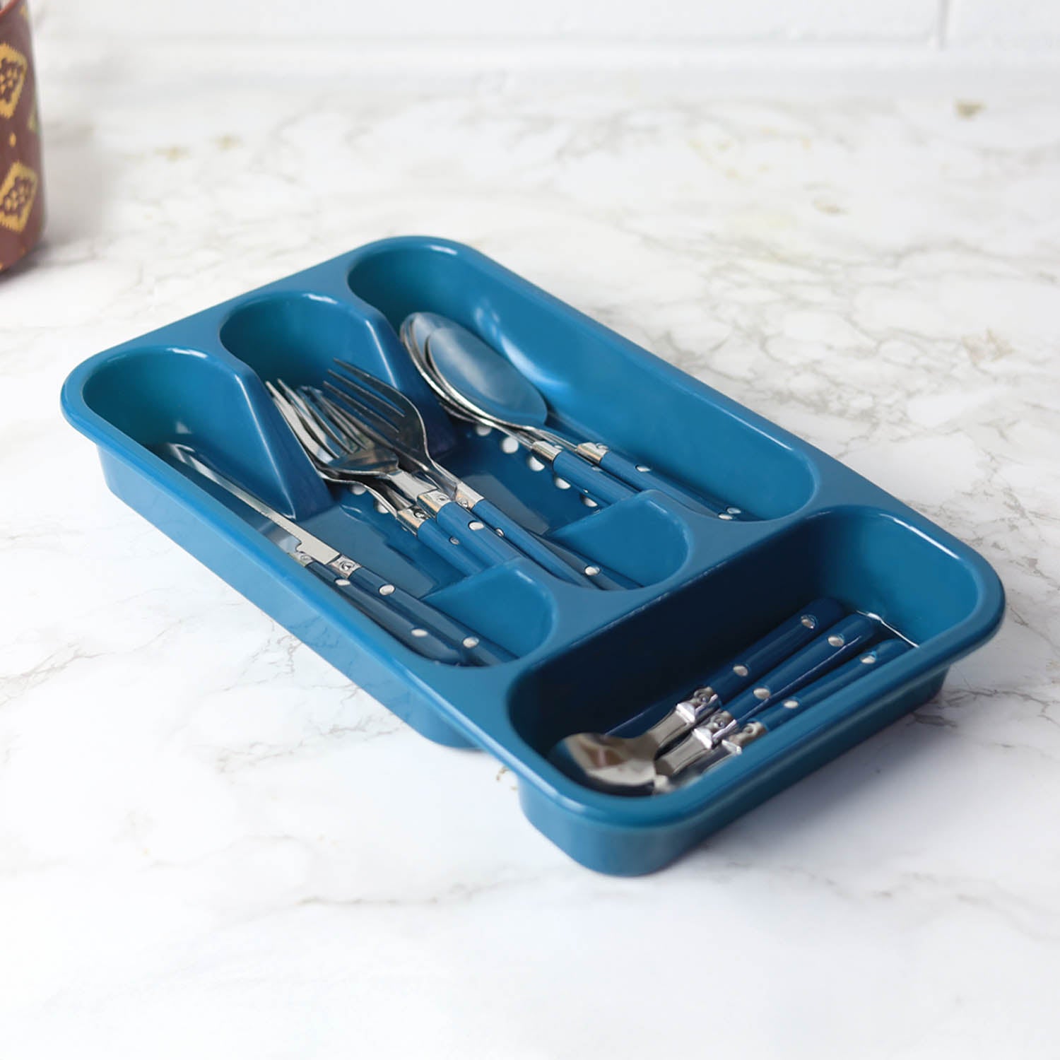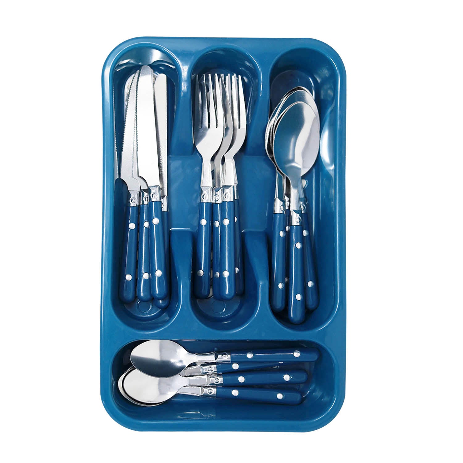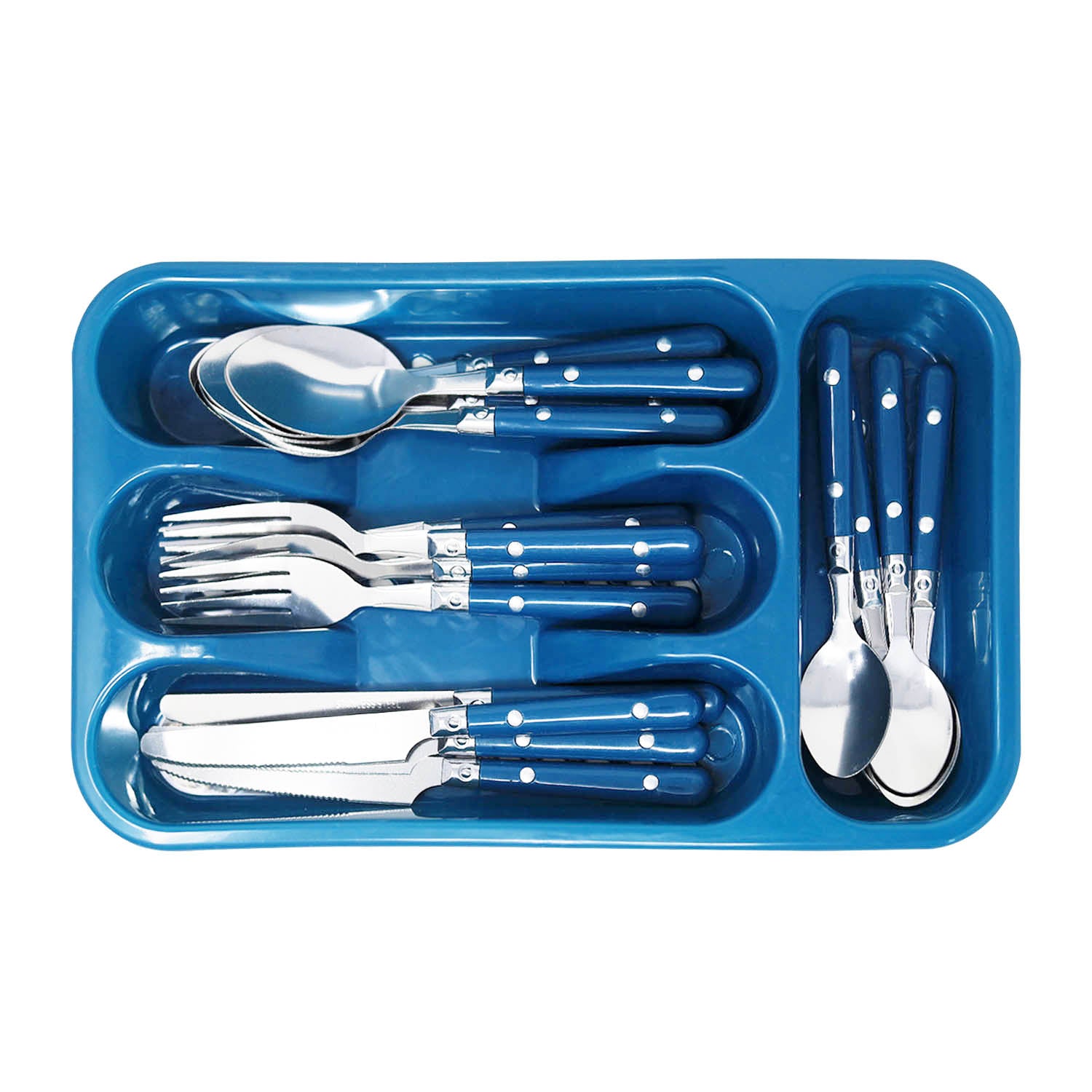 16-piece cutlery set with stainless steel utensils and blue plastic handles. Comes in a matching blue tray (32x19.5cm) with compartments – perfect as a drawer insert for neat storage.