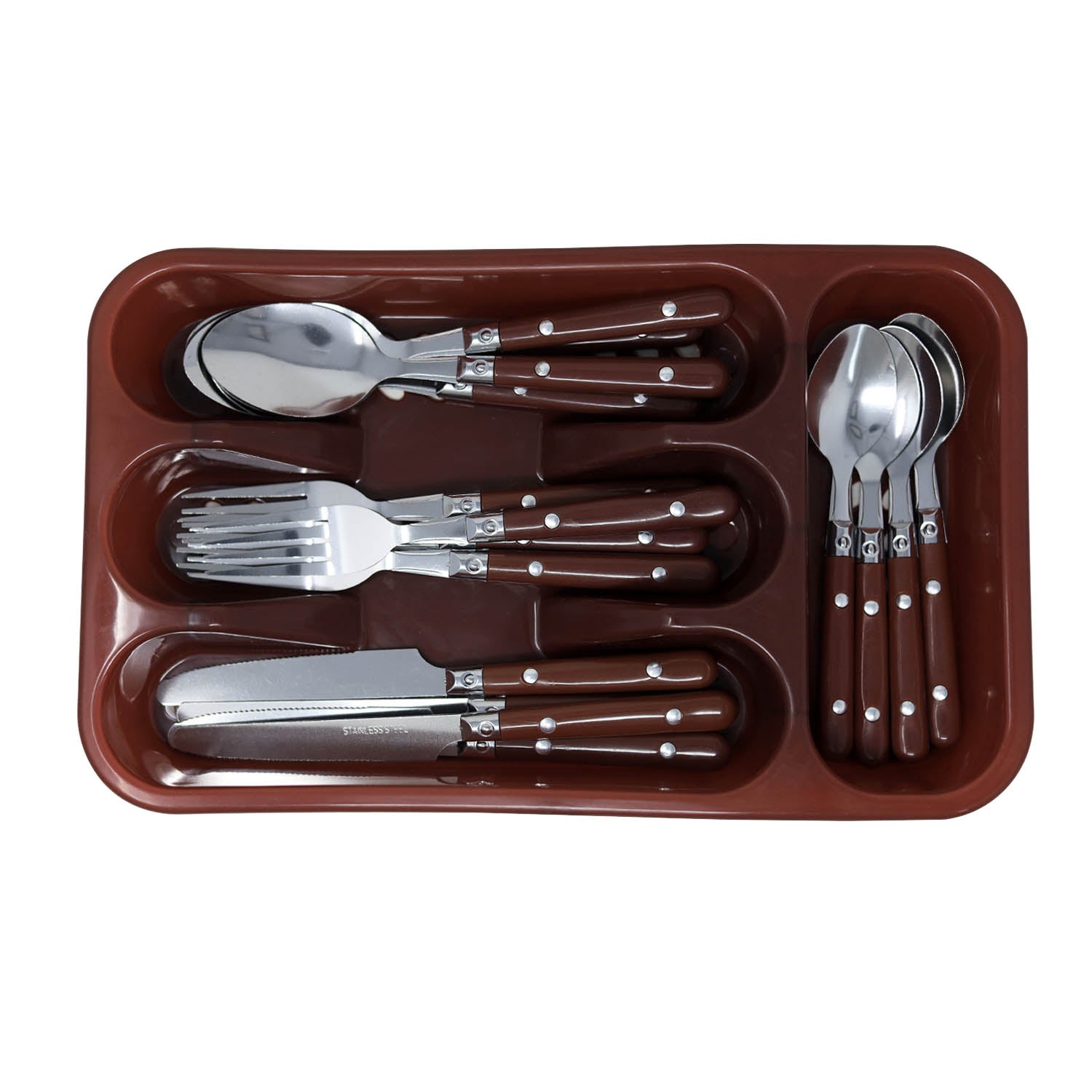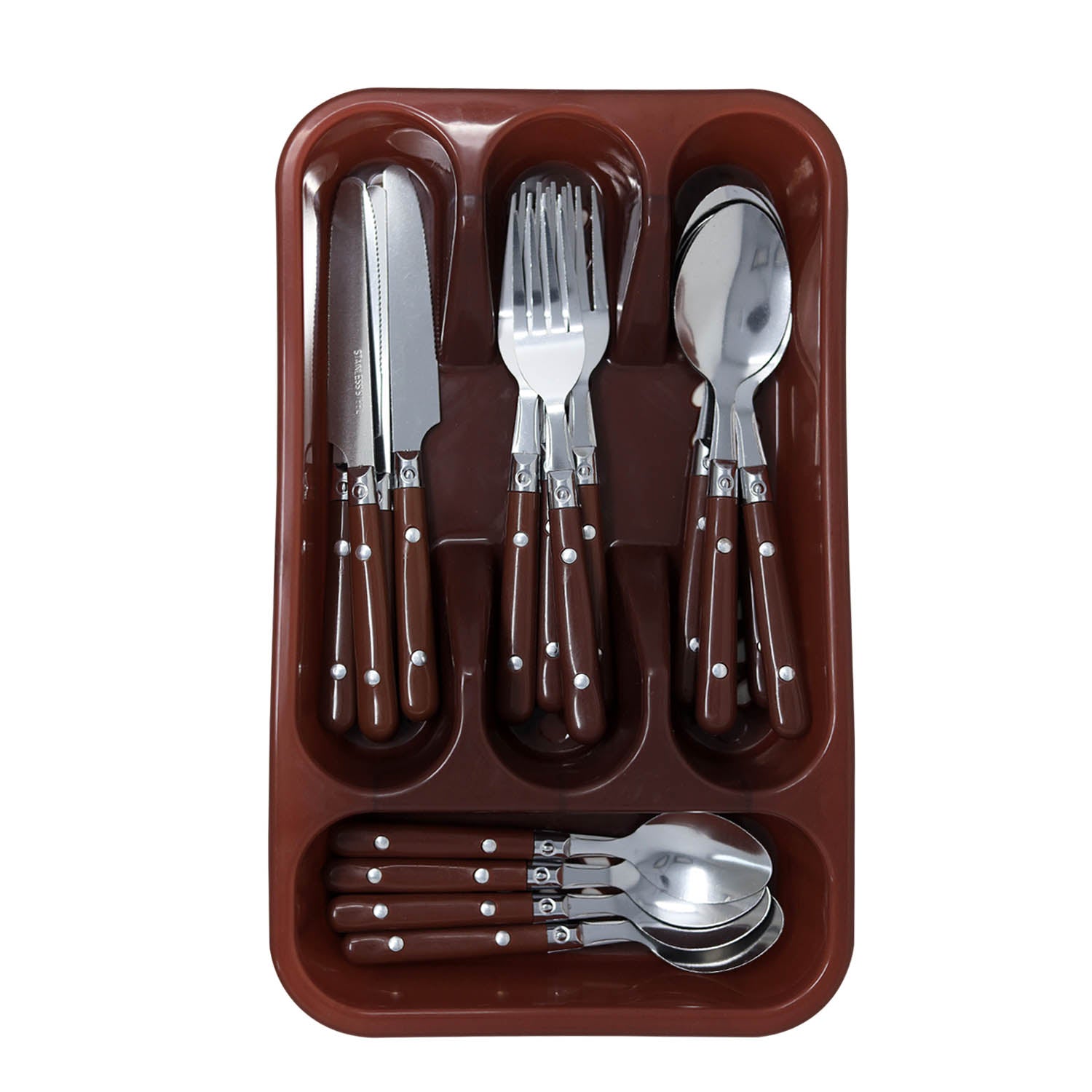16-piece cutlery set with stainless steel utensils and maroon plastic handles. Comes in a matching maroon plastic tray (32x19.5cm) with compartments – perfect as a drawer insert for neat storage.