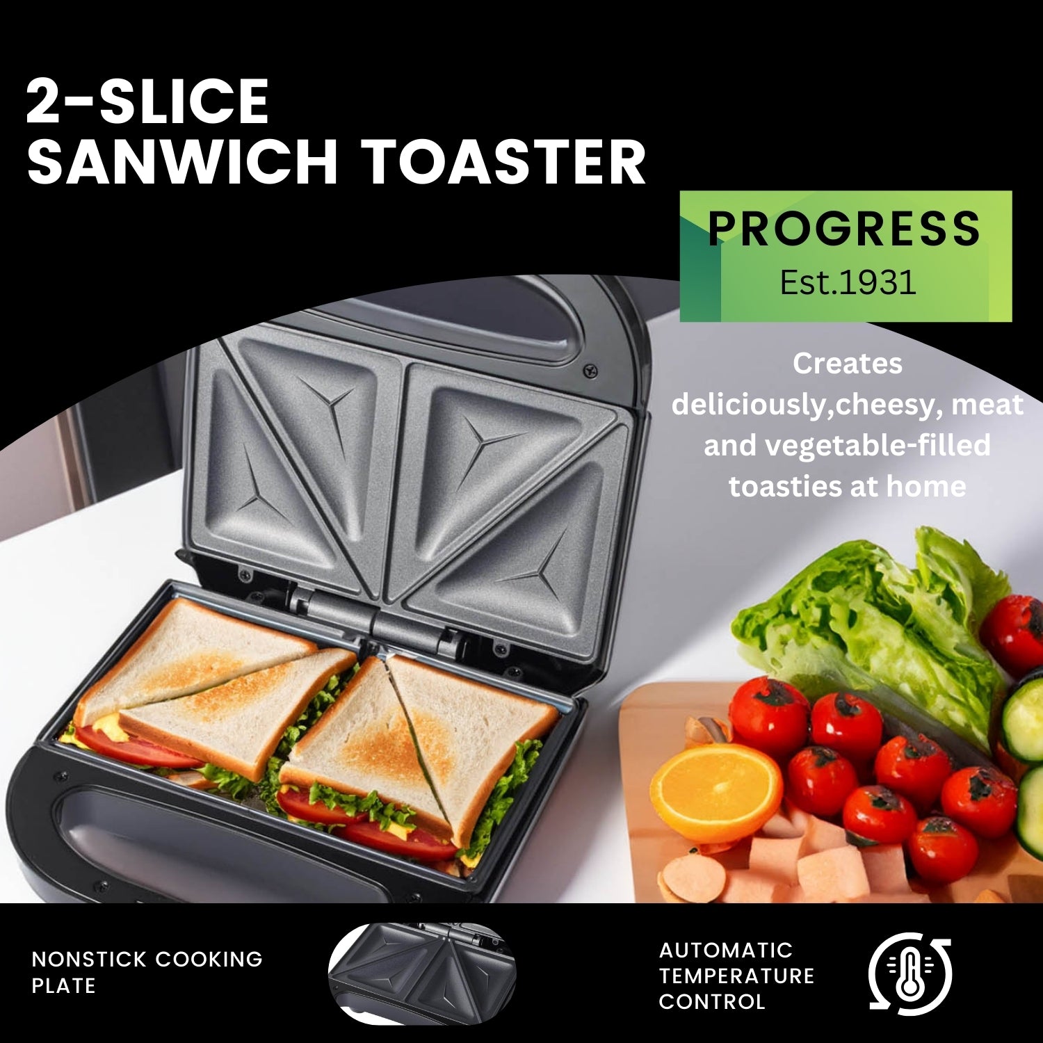 - Whip up a toastie with your favourite filling using the Progress 2-slice sandwich toaster with no oil needed for a low-fat alternative.