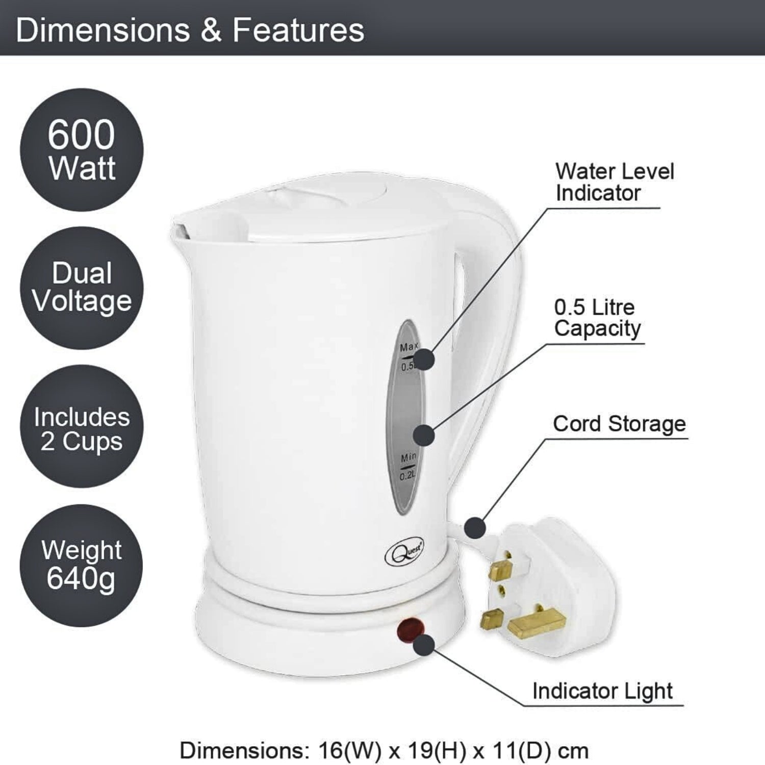 Quest 0.5 L Dual Voltage Electric Travel Kettle 600W White