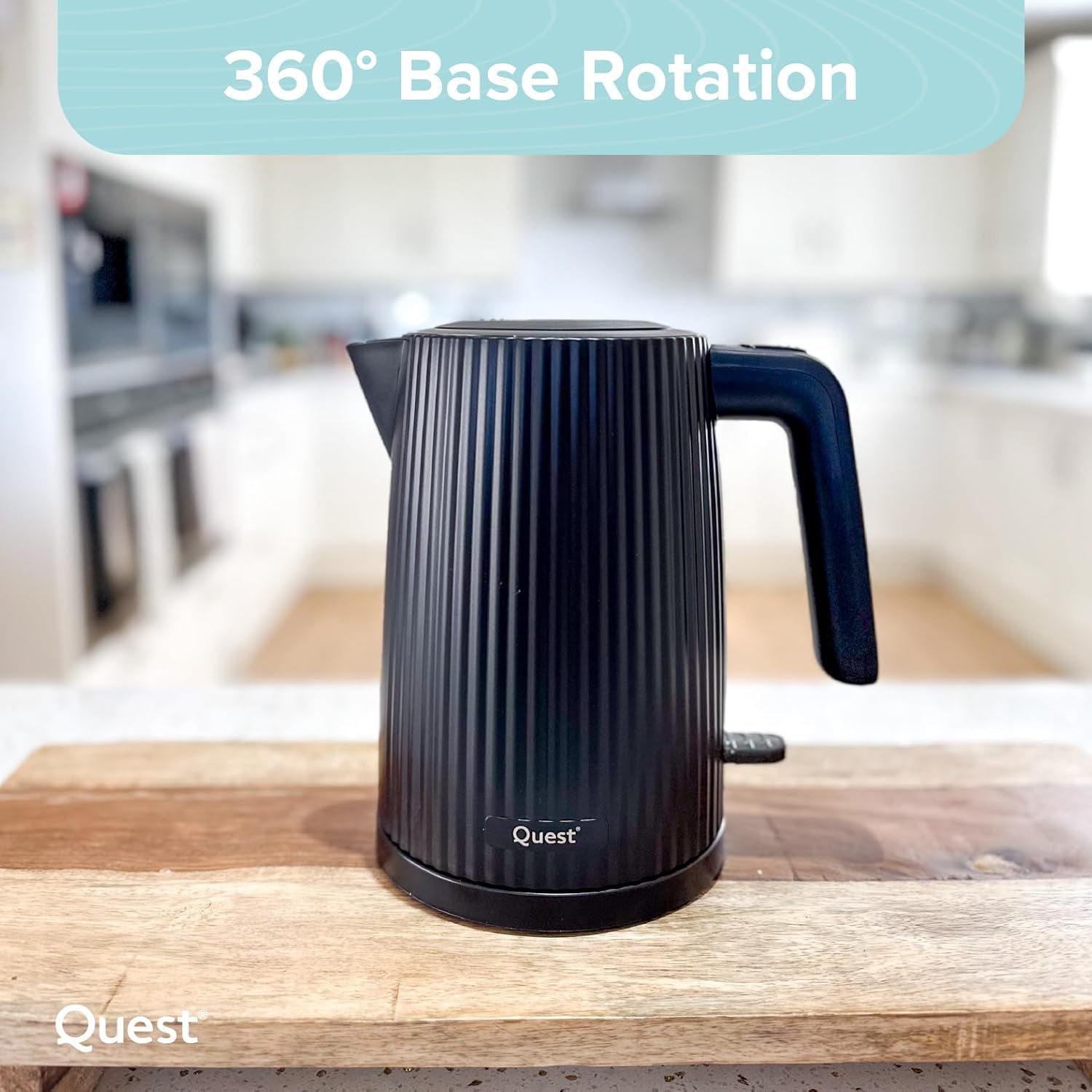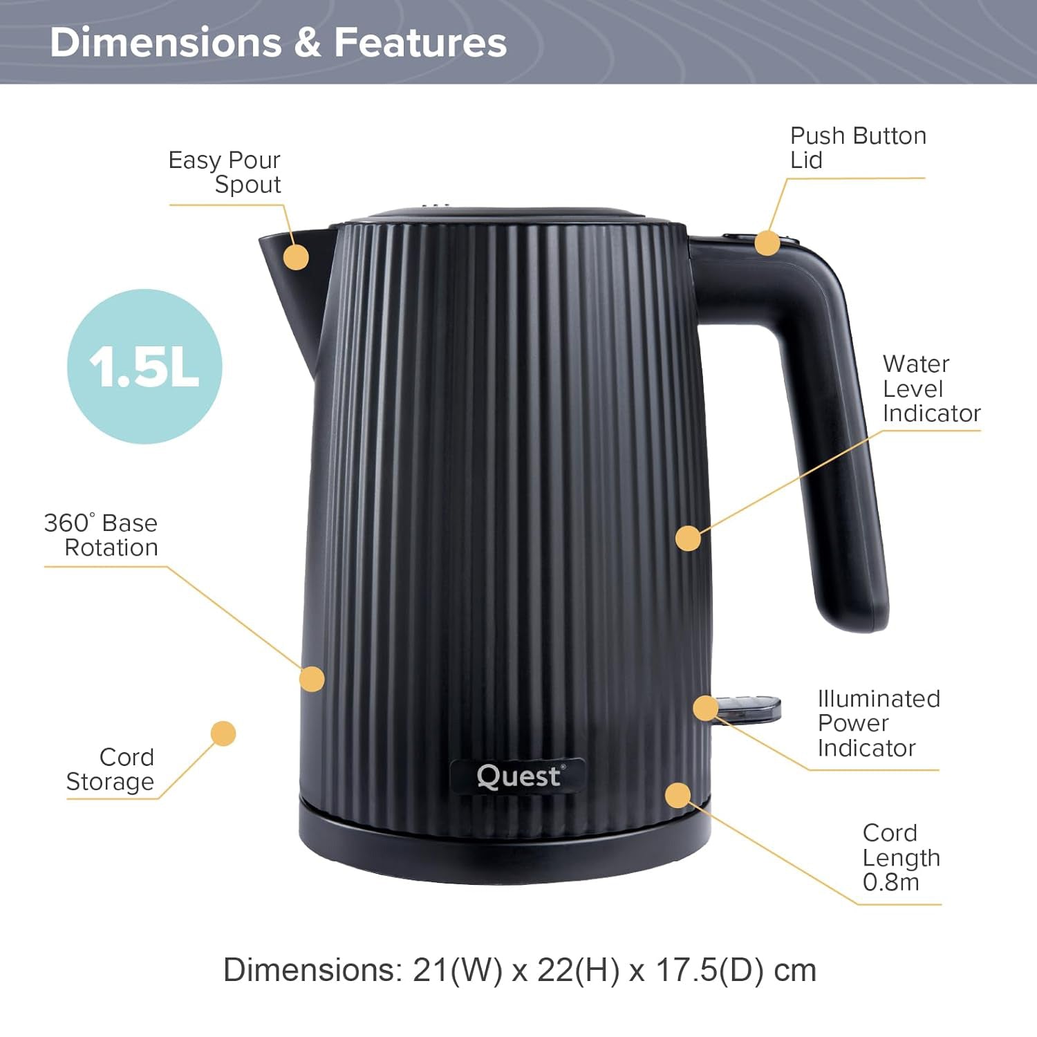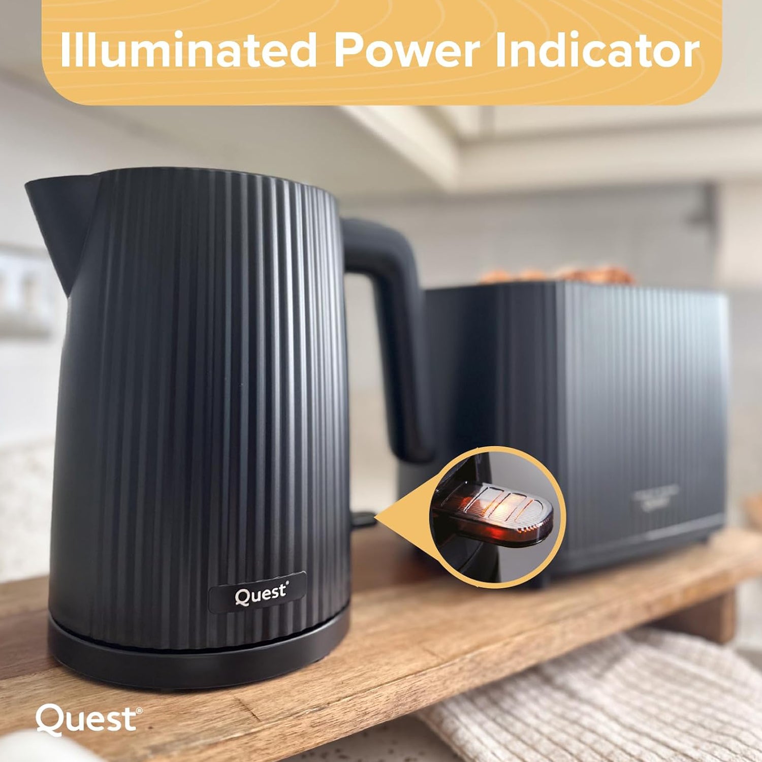 Quest 1.5L 3000W Black Electric Kettle & 2-Slice Grooved Toaster Set