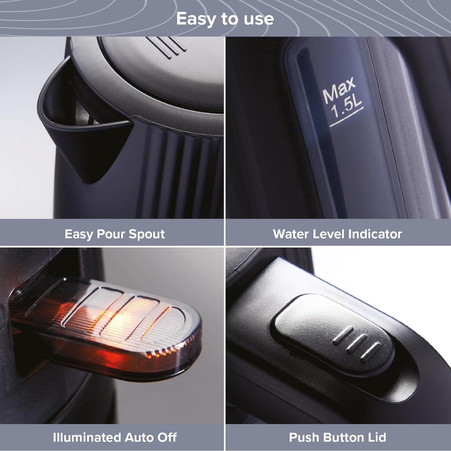 - The 1.5L rapid-boil kettle (3000W) includes an easy pour spout, push-button lid, water level indicator, and illuminated auto shut-off. The 930W toaster offers 7 browning levels, auto-centring, reheat, defrost, and cancel functions.