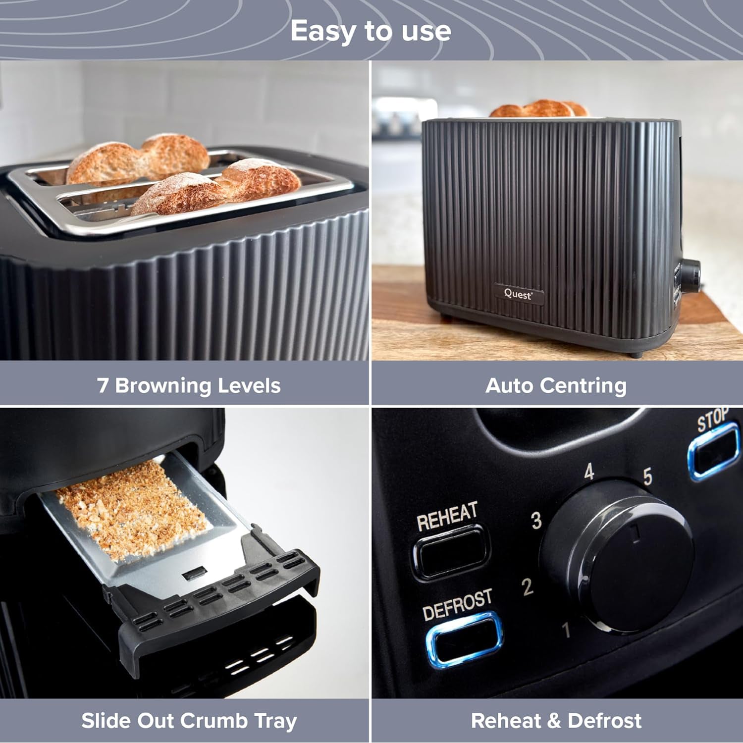 Upgrade your kitchen with the stylish and functional Quest Electric Kettle & Toaster Set. Featuring a coordinated ribbed black plastic design, the 1.5L 3000W rapid boil kettle includes a water level indicator, push-button lid, and auto shut-off. The matching 2-slice 930W toaster offers 7 browning levels, reheat/defrost/cancel settings, and a removable crumb tray for easy cleaning. Both appliances are 240V and perfect for daily breakfast prep.