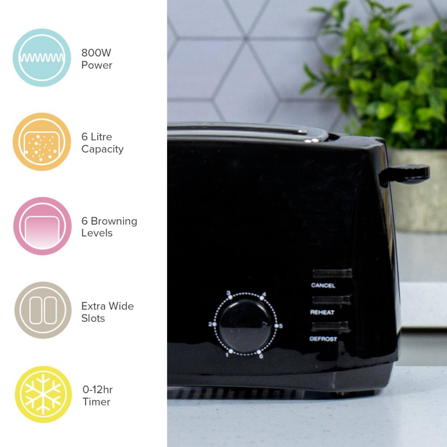 - Defrost, Cancel & Reheat Functions – Defrost frozen bread, reheat toast without burning, and cancel anytime for full control.