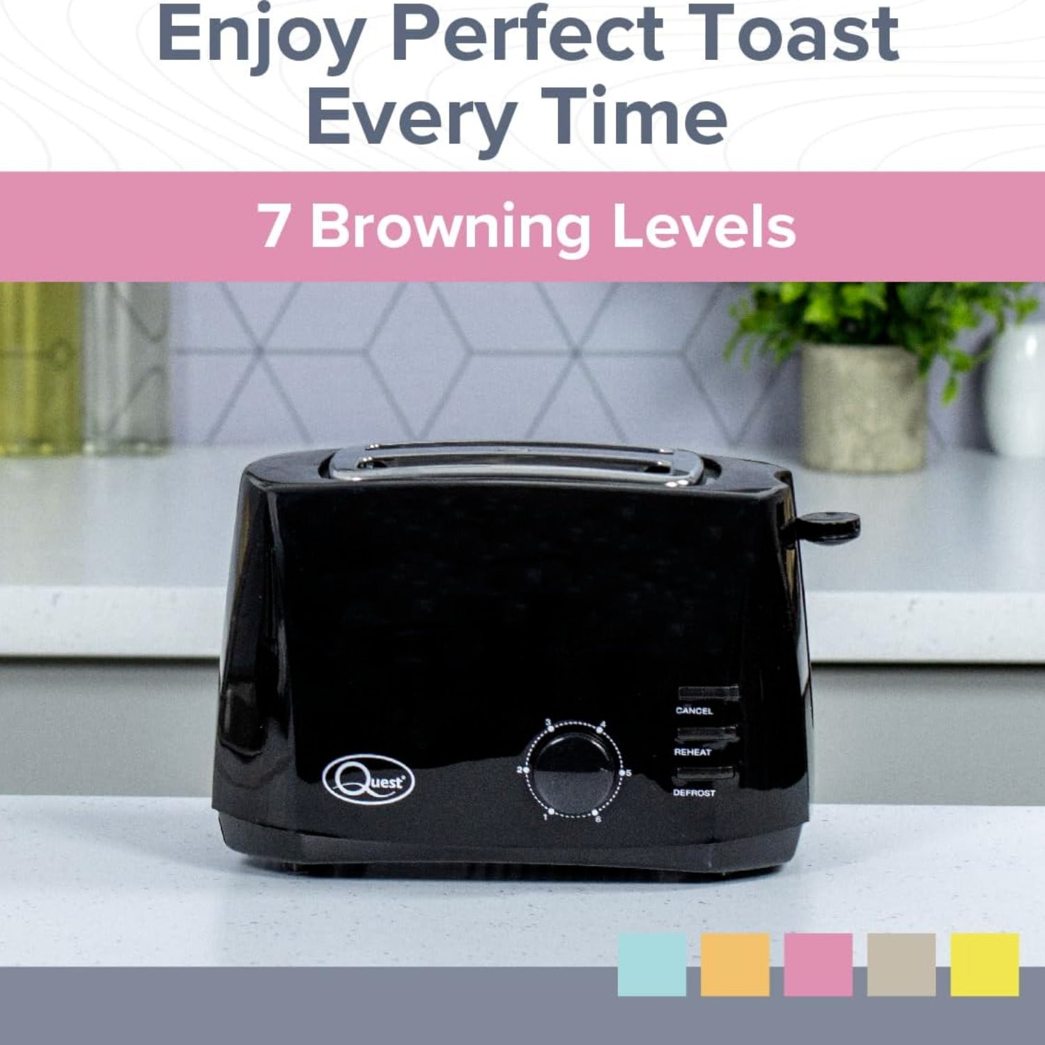 The Quest 2-Slice Toaster is a practical and stylish kitchen appliance. It offers wide slots for different bread types, adjustable browning for perfect results, and convenient functions like defrost, reheat, and cancel for complete control. With a crumb tray for easy cleaning and cord storage for a clutter-free counter, it’s ideal for everyday use in any kitchen.