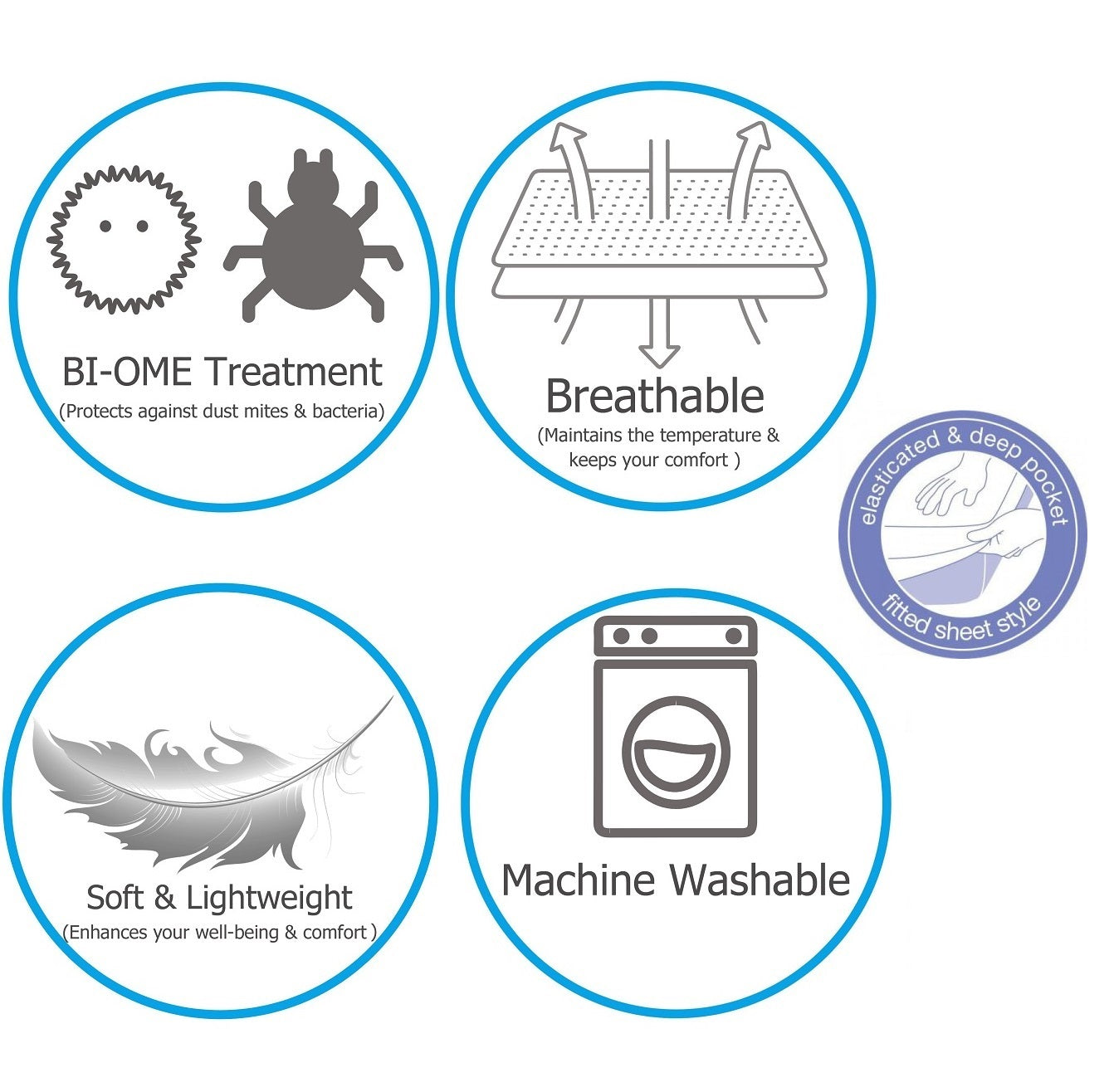 Every night, while at sleep, the body releases skin flakes and body fluids that accumulate in a mattress. This mattress protector is an antimicrobial barrier between you and the mattress. It draws moisture away from skin to help balance body temperature. Protector fabric retains its natural softness to give you an extra luxury. It is capable of withstanding wear and tear or decay, a durable fabric, able to perform or compete over a long period, as by avoiding and overcoming damages to your mattress. It can be fit on most of the mattresses up to 30cm. Material is Polyester, it is machine washable.