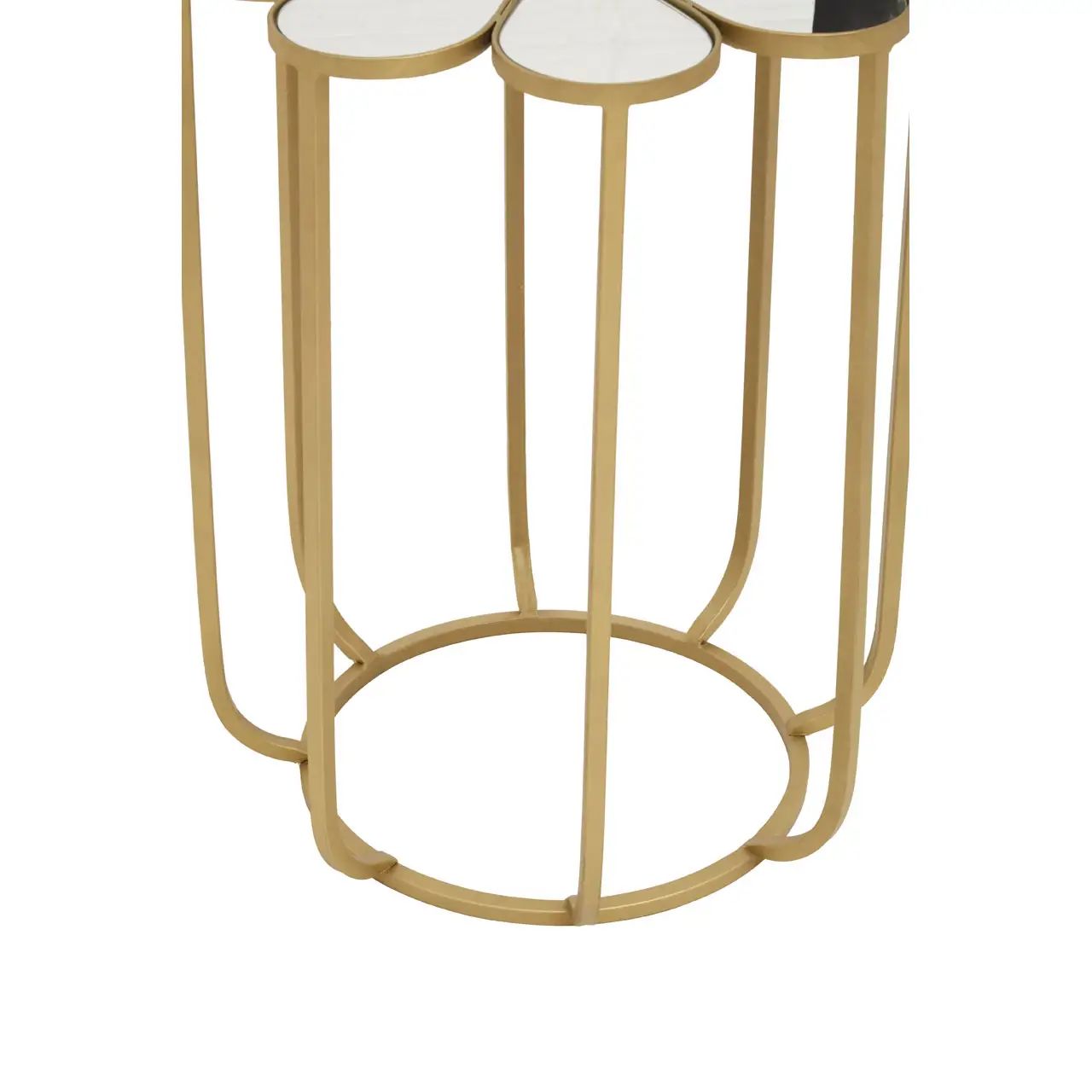 The flower cocktail side table features hand-hammered petals that shape a mirrored tabletop. Sleek lines in a gold finish gracefully descend from the top to form an elegant openwork base.