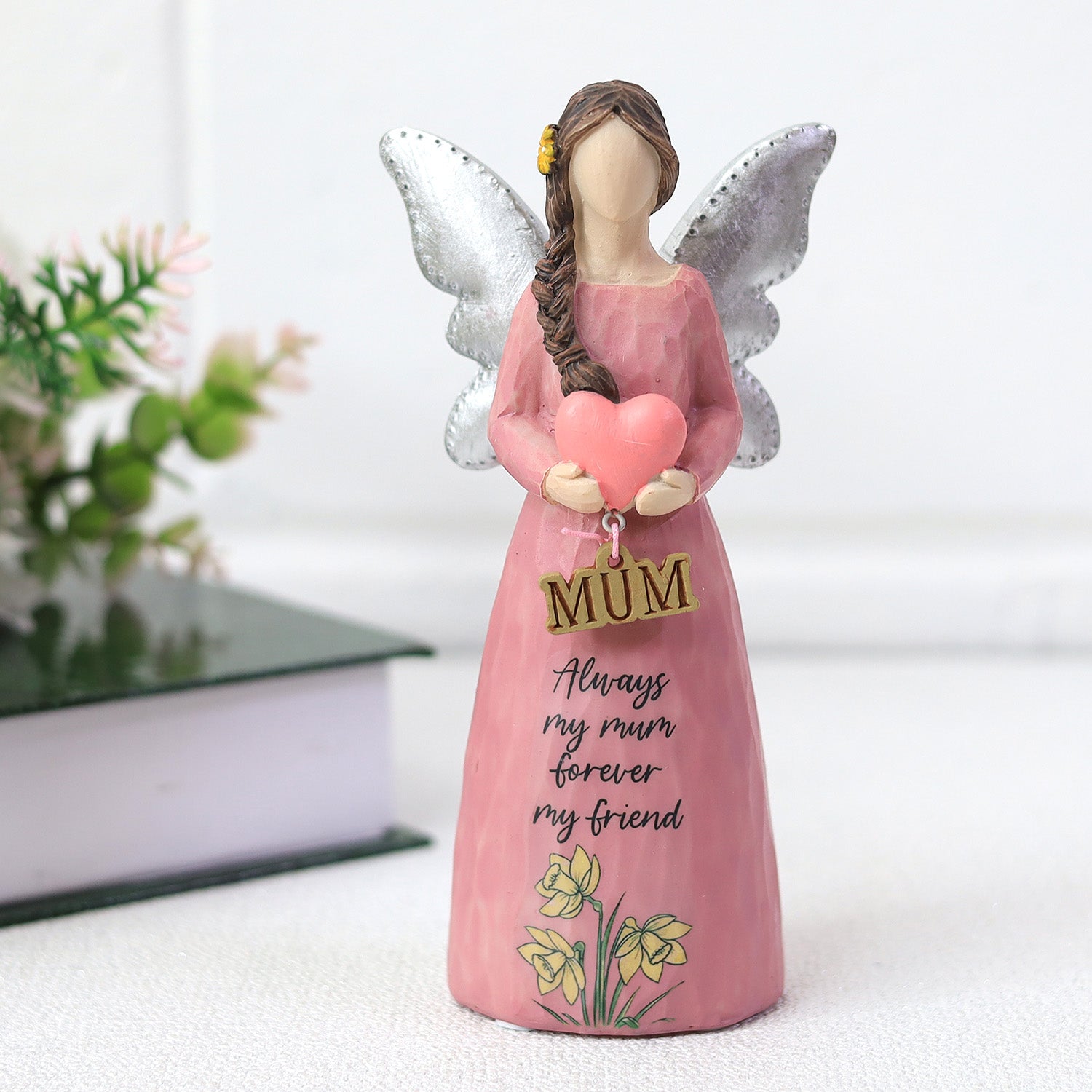 - Sentimental angel figurine holding a pink heart, symbolizing love and appreciation for Mum.