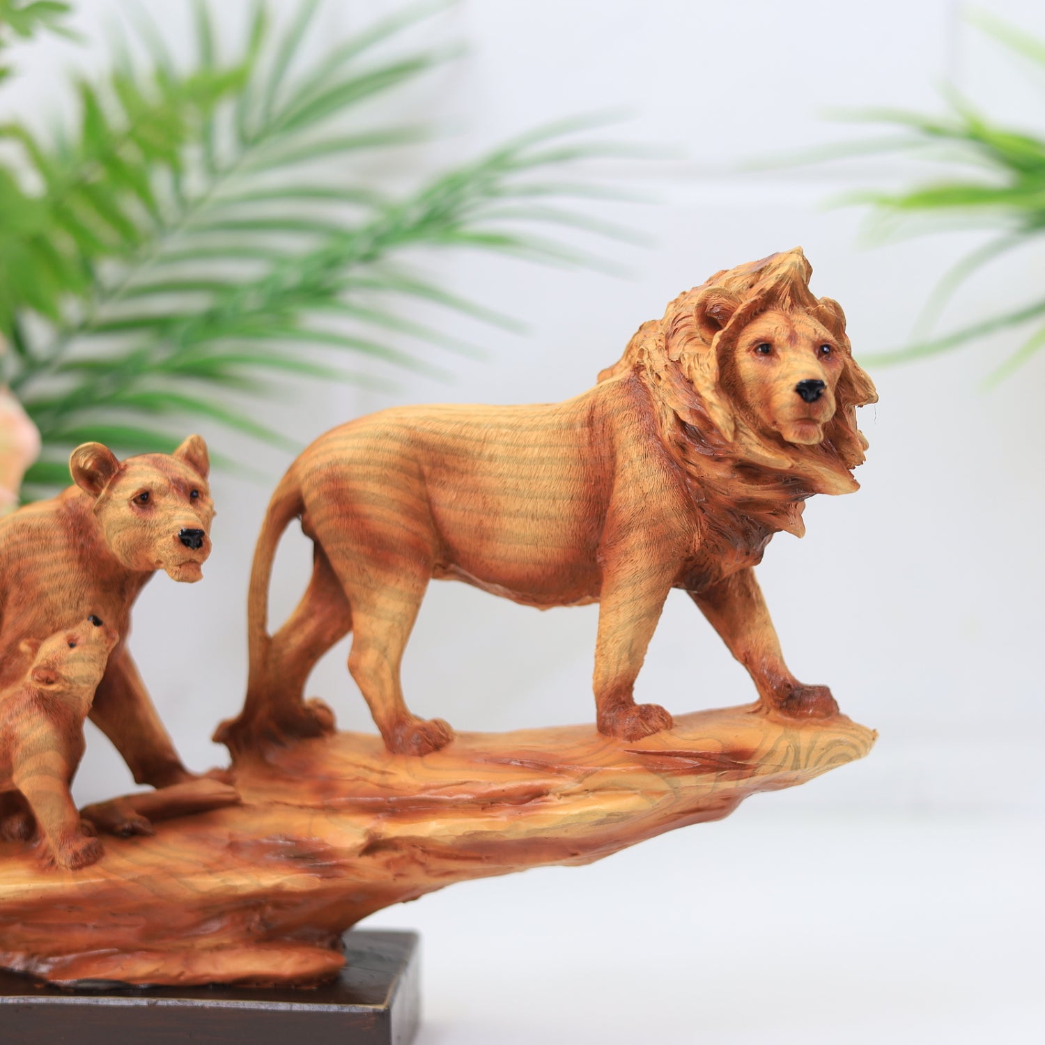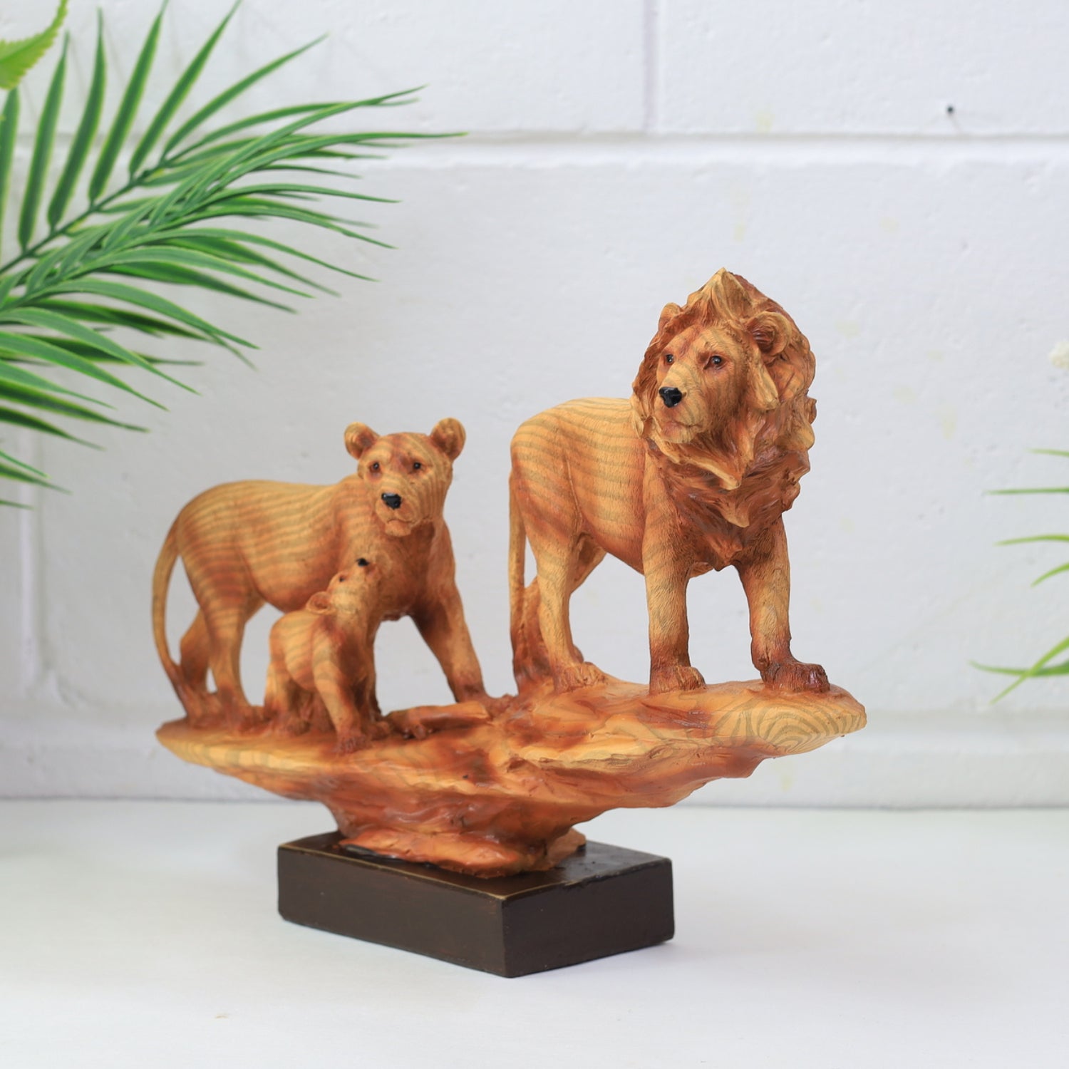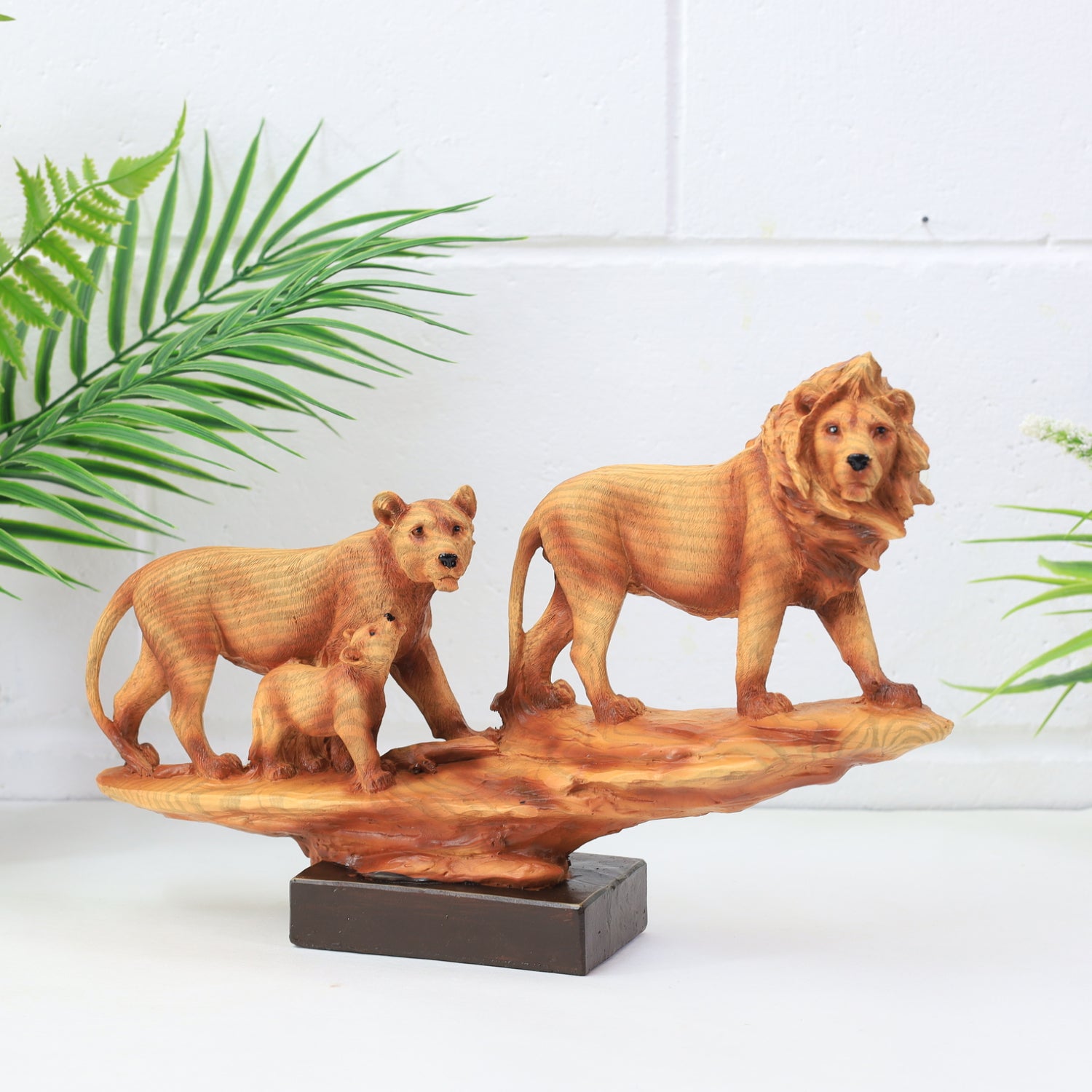 Bring the majesty of the wild into your home with this 3d lion family figurine set. Featuring a beautifully detailed lion, lioness, and cub walking together, this polyresin sculpture is designed with a natural wood effect finish that adds warmth and character to your decor. The figurines rest on a modern black concrete effect base, blending rustic charm with contemporary design.