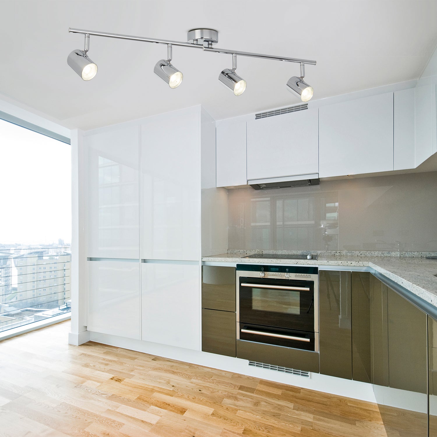Add brightness to your home using this 4 light split bar. The adjustable four lights sit elegantly upon a long chrome bar, which is attached to a solid base. It is ideal for placing in a modern kitchen, or any room needing a warm spread of light.